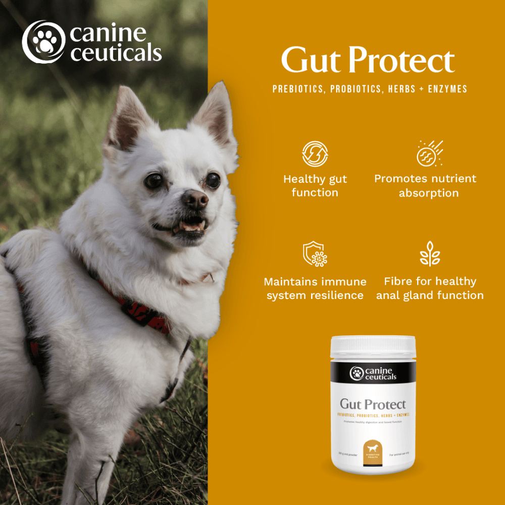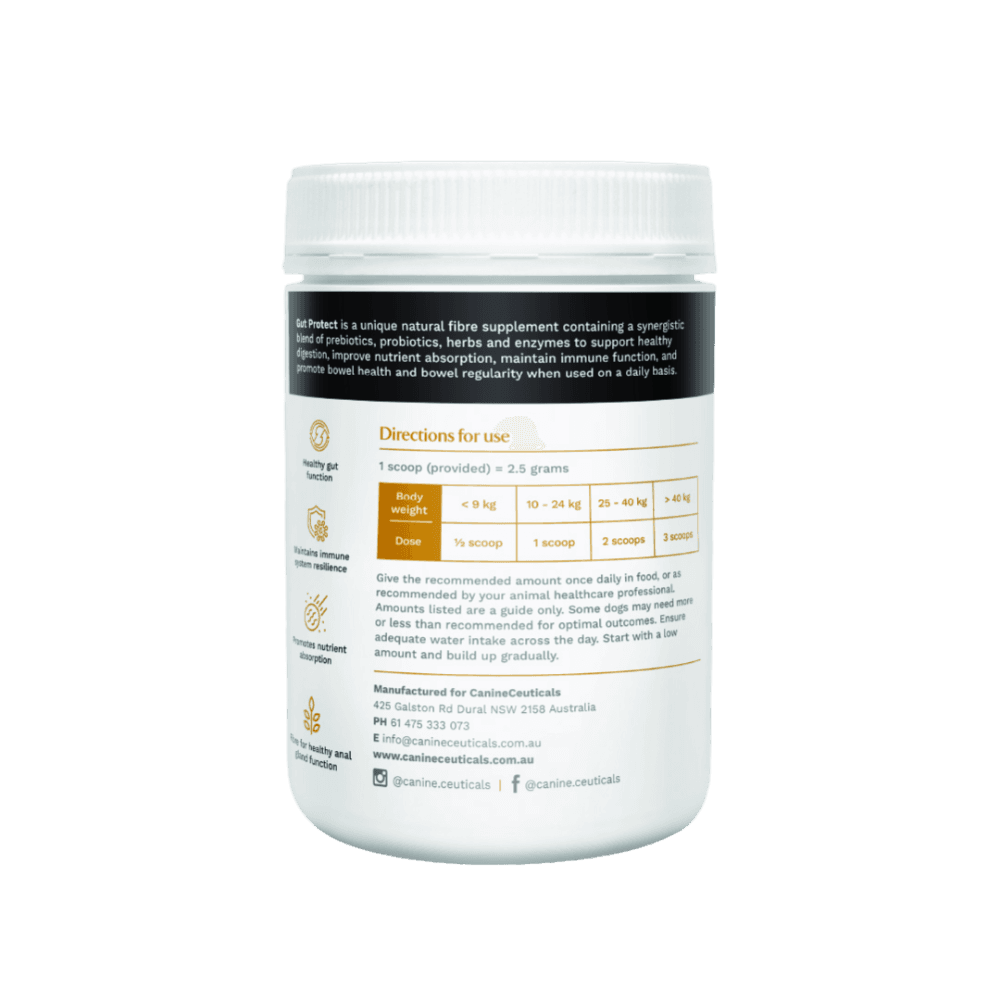 CanineCeuticals Gut Protect Digestive Support for Dogs is a natural fibre formula combining prebiotics, probiotics, herbs, and enzymes to support healthy digestion. It promotes nutrient absorption, immune function, and regular bowel movements Just sprinkle over or mix into your pet's food-too easy!