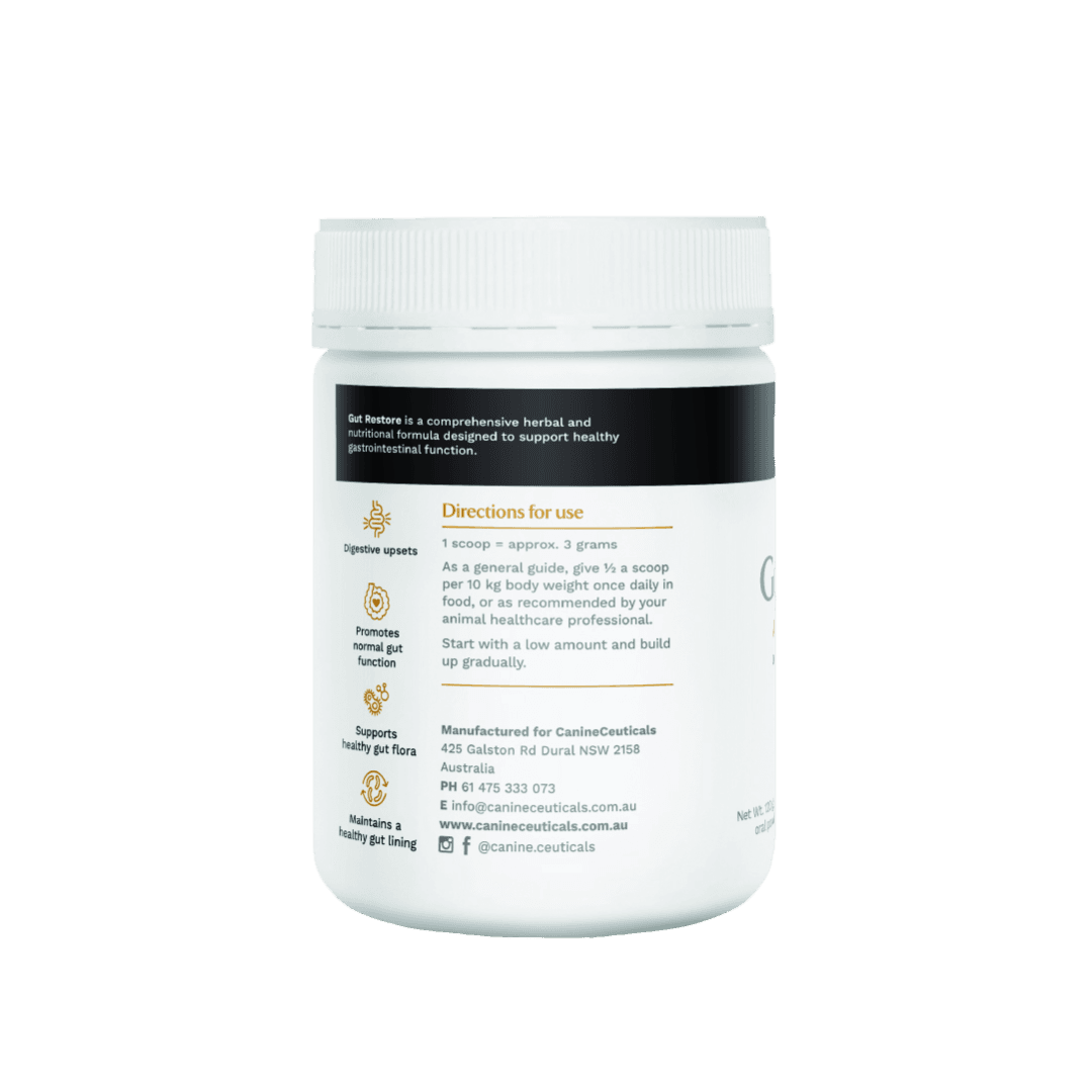 CanineCeuticals Gut Restore Advanced GI Support Powder For Dogs is a comprehensive herbal and nutritional supplement designed to support and maintain healthy gastrointestinal function in dogs. Formulated with a blend of amino acids, herbal extracts, and essential nutrients, it aims to promote gut healing, support immune function, and maintain a balanced gut microbiome. Just sprinkle over or mix into your pet's food-too easy!