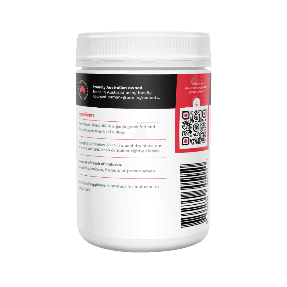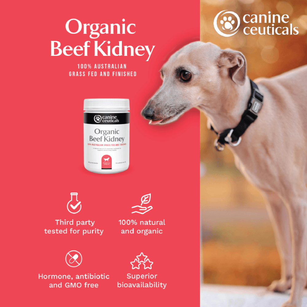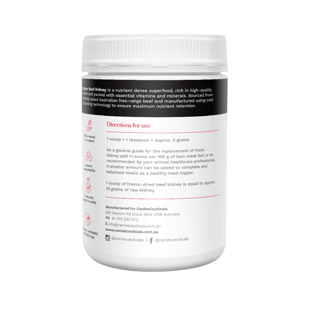 CanineCeuticals Organic Beef Kidney Nutrient Powder For Dogs is a nutrient-dense supplement made from 100% organic, grass-fed, and finished Australian beef kidney. This freeze-dried powder provides a rich source of essential vitamins, minerals, and enzymes to support your dog's overall health and well-being. Just sprinkle over or mix into your pet's food-too easy!