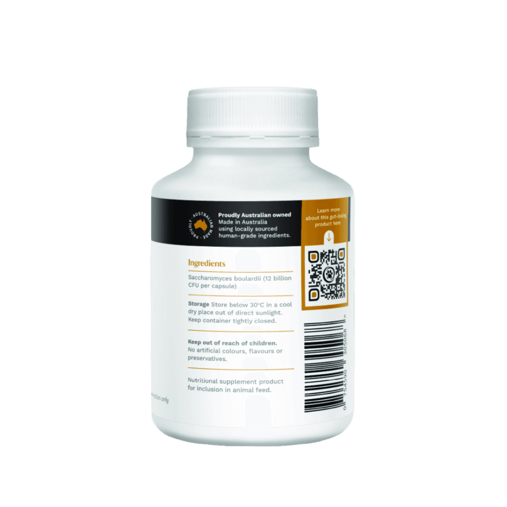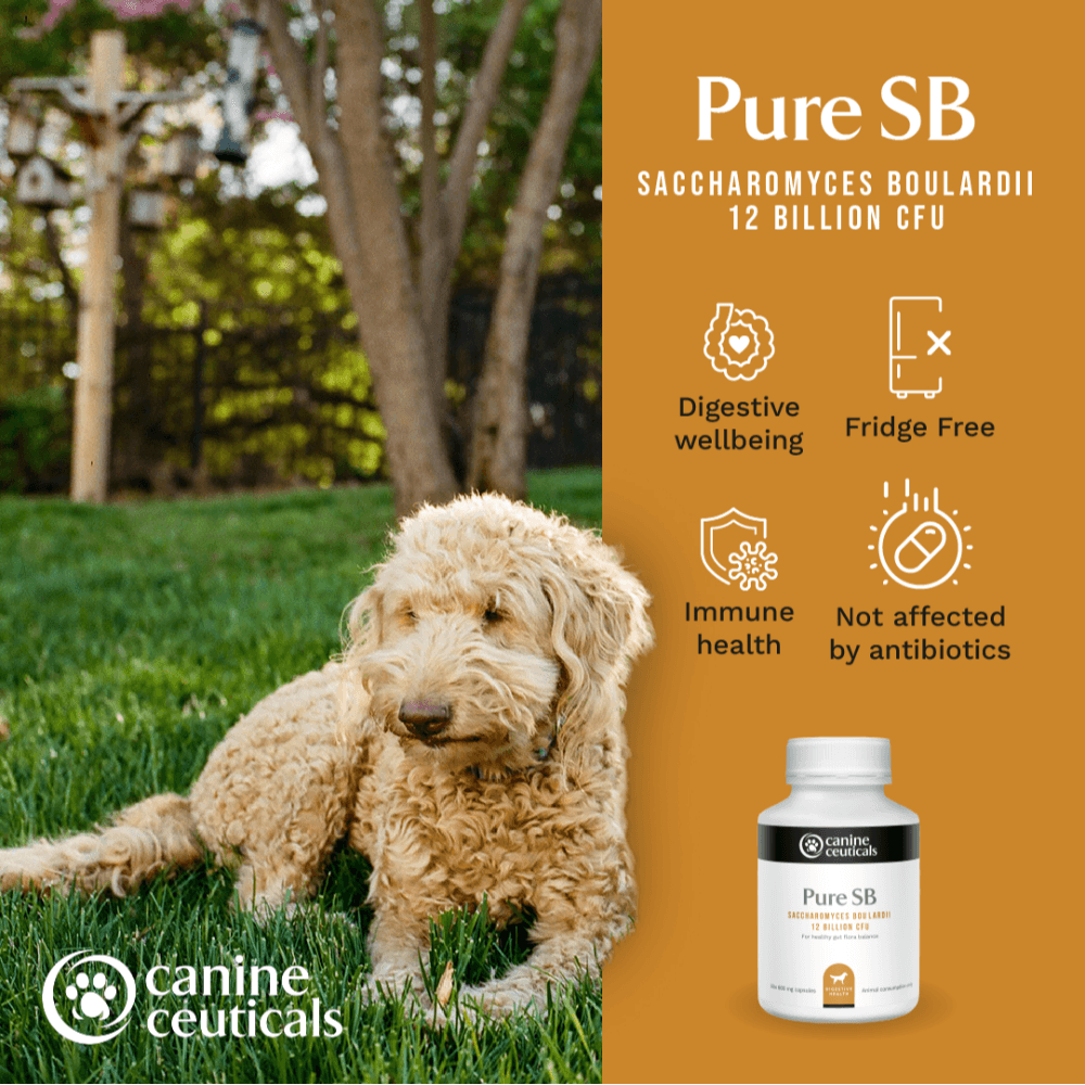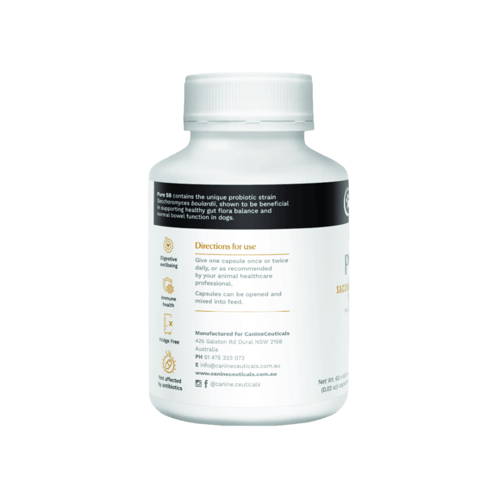 CanineCeuticals Pure SB Probiotic contains Saccharomyces boulardii, a probiotic strain beneficial for gut flora balance and normal bowel function, especially during antibiotic use