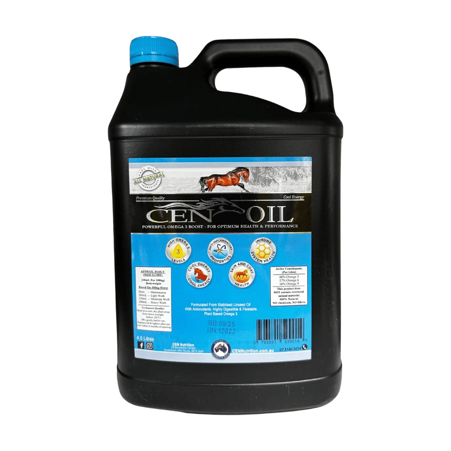 Cen Oil is a highly concentrated natural supplement to promote overall health in horses, enriched with omega-3 fatty acids for improved skin, coat, joint health, and digestive wellness. CEN Nutrition champions equine health with natural, nutrient-rich products. This Australian-owned brand bridges the gap between nutrition and pharmaceutical care for horses, focusing on natural horse coat health oil and supplements that deliver results without synthetic additives.