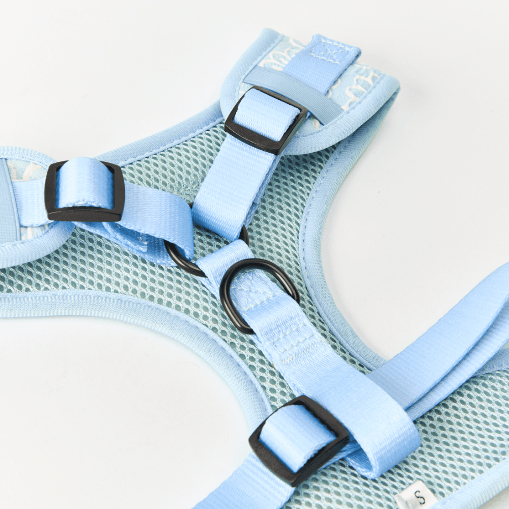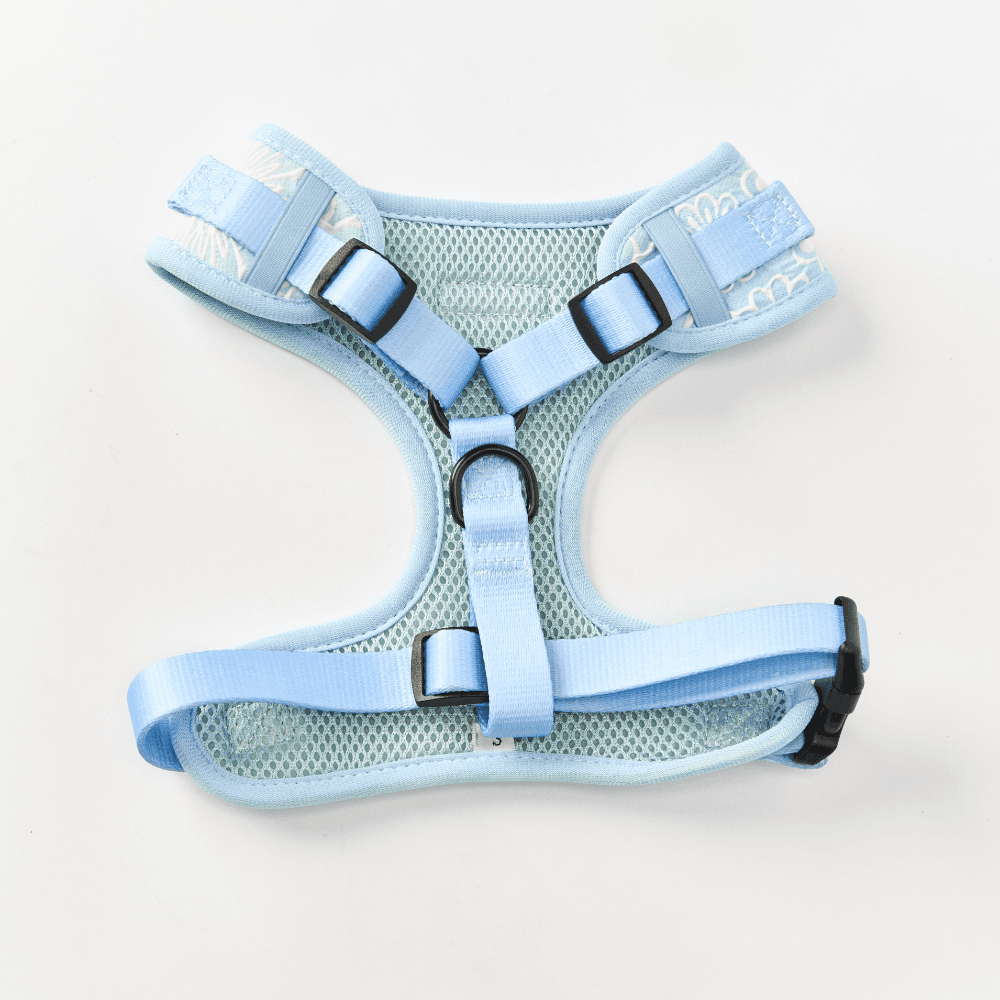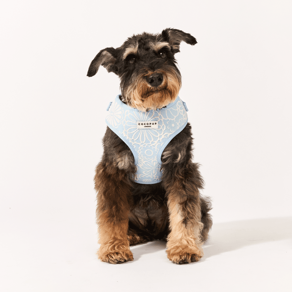 The Cocopup London Dog Harness in Baby Blue Flower blooms in breezy blue with a gentle, ventilated feel. It's simple to size and sits flat for steady handling. Pastel charm with everyday practicality.