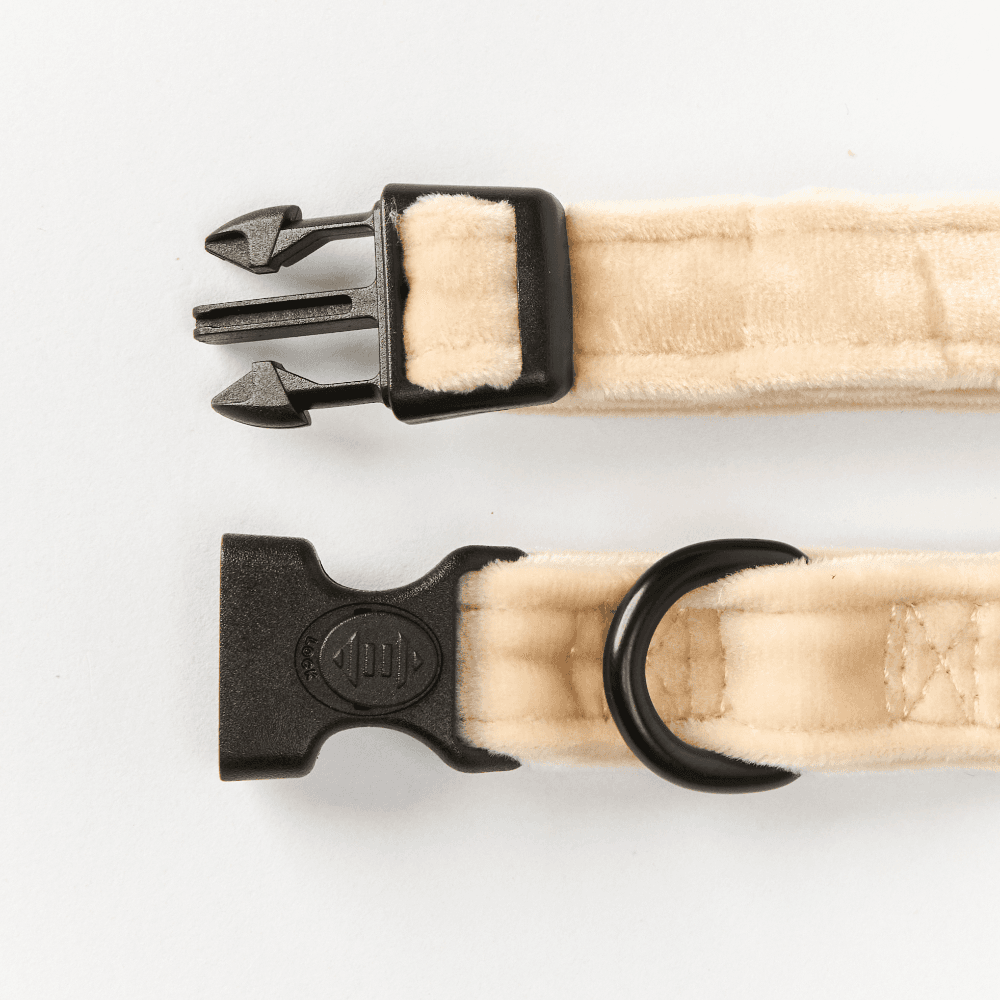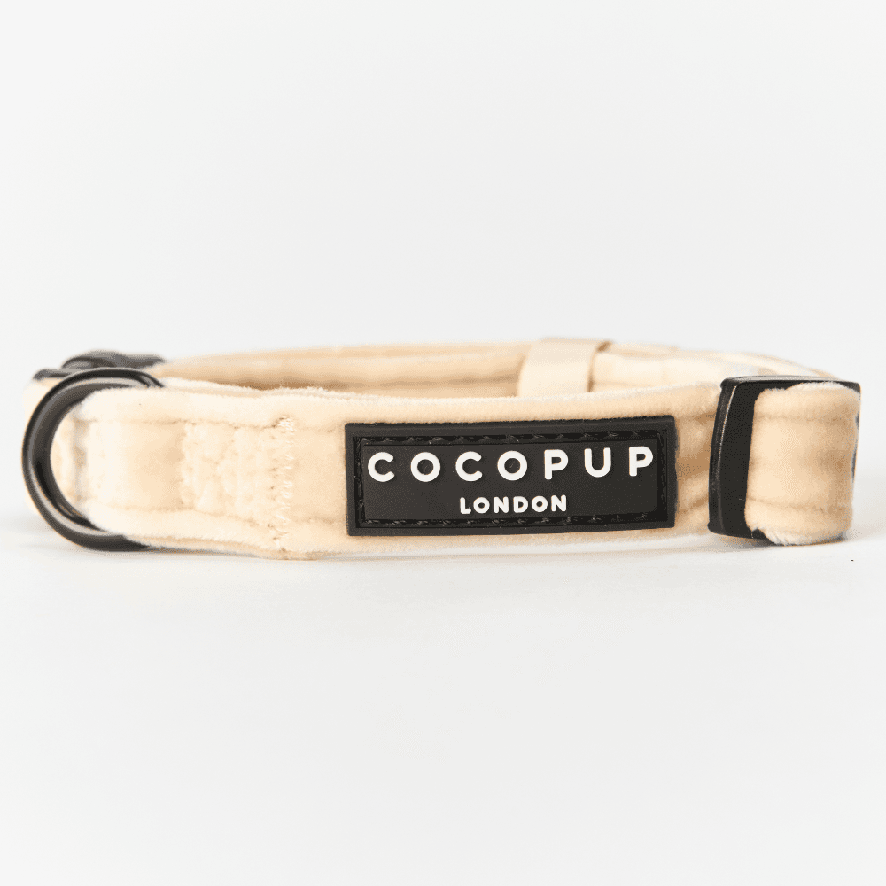 The Cocopup London Luxe Dog Collar in Champagne Velvet is a soft-cream statement that stays comfy all day. Adjust the fit, clip to the D-ring and head out-the safety-lock buckle makes on/off easy while the velvet finish brings the glam.