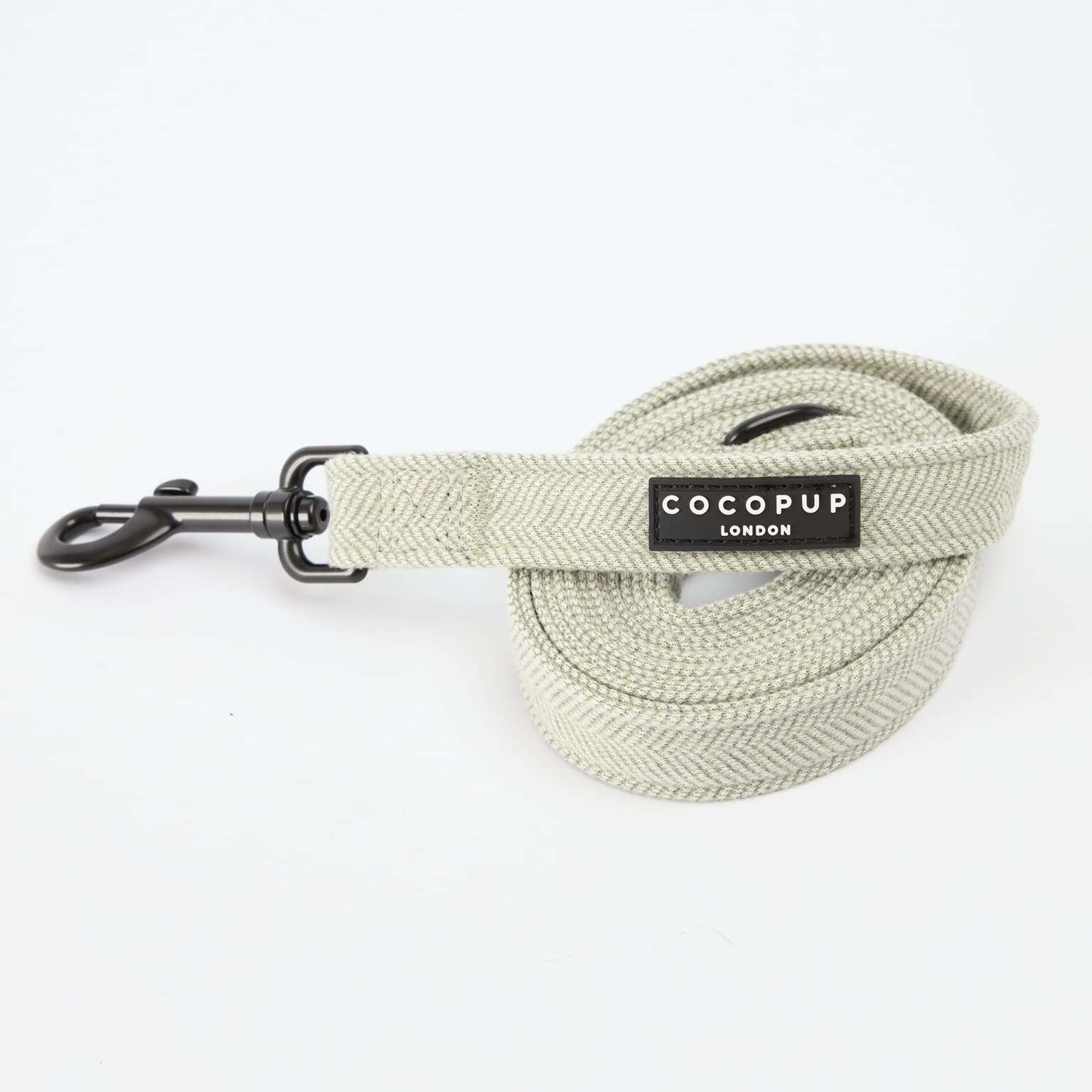 The Cocopup London Classic Dog Lead in Sage Tweed brings soft herringbone texture and everyday comfort. A padded handle, smooth swivel clip and poop-bag D-ring keep strolls neat and stylish.