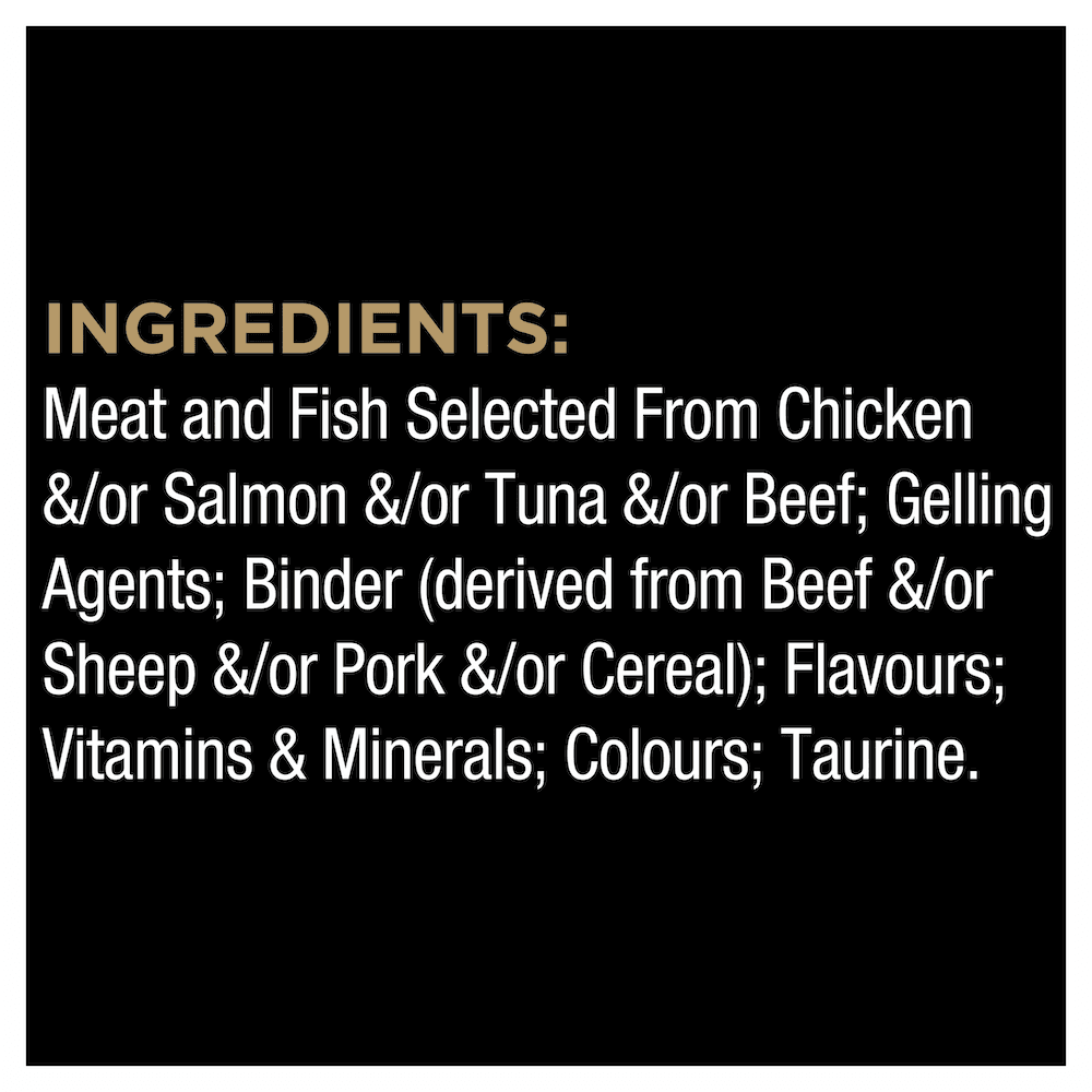 Chicken; Salmon; Beef; Lamb; Gelling Agents; Cereal Protein; Flavours; Colours; Taurine; Minerals; Vitamins.