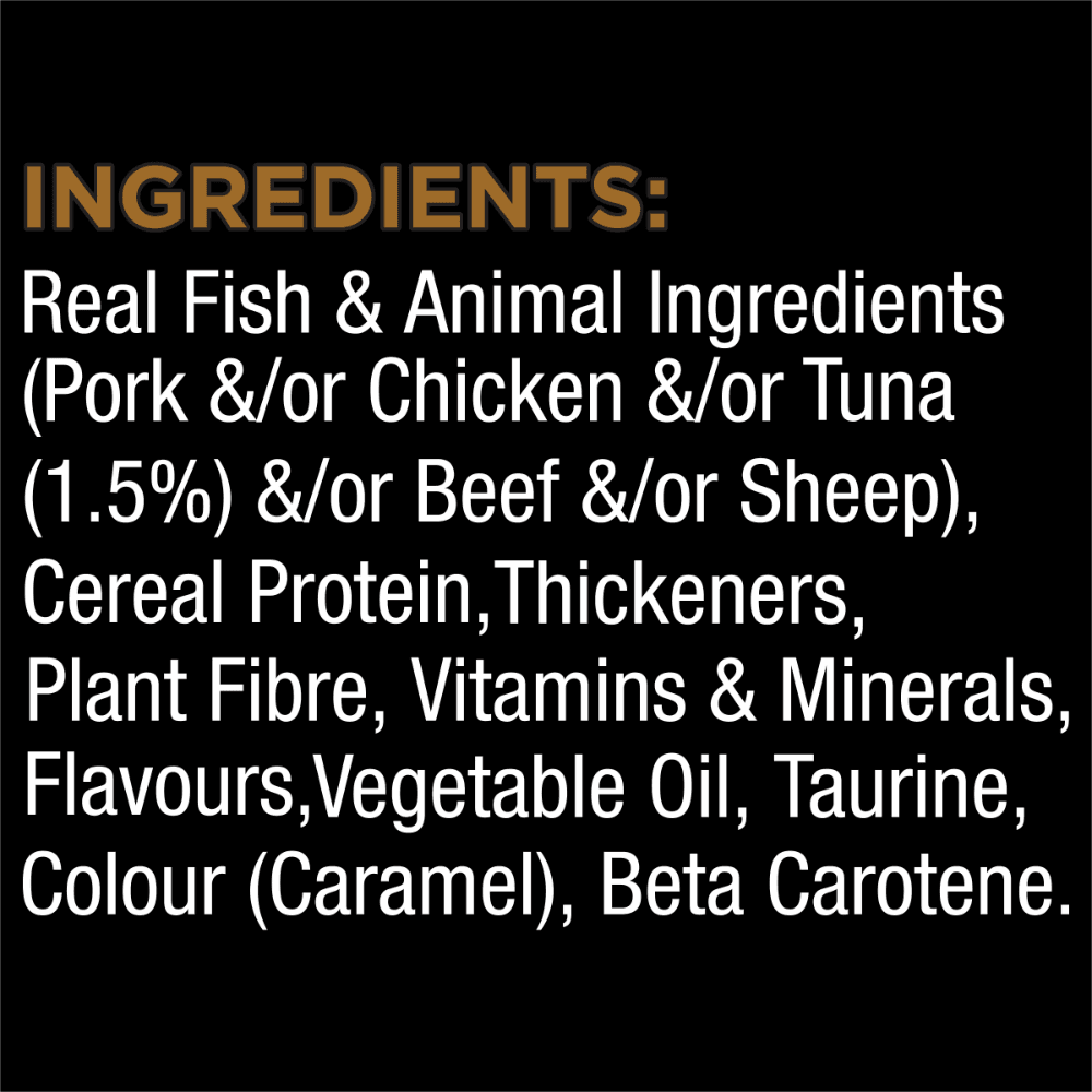 Ingredients Meats (including Pork &/or Chicken &/or Beef &/or Sheep), Binder (Cereal), Fish (including Tuna), Plant Fibre, Thickener, Vitamins & Minerals, Gelling Agents, Flavours, Salt, Amino Acid, Colouring Agents, Beta Carotene.