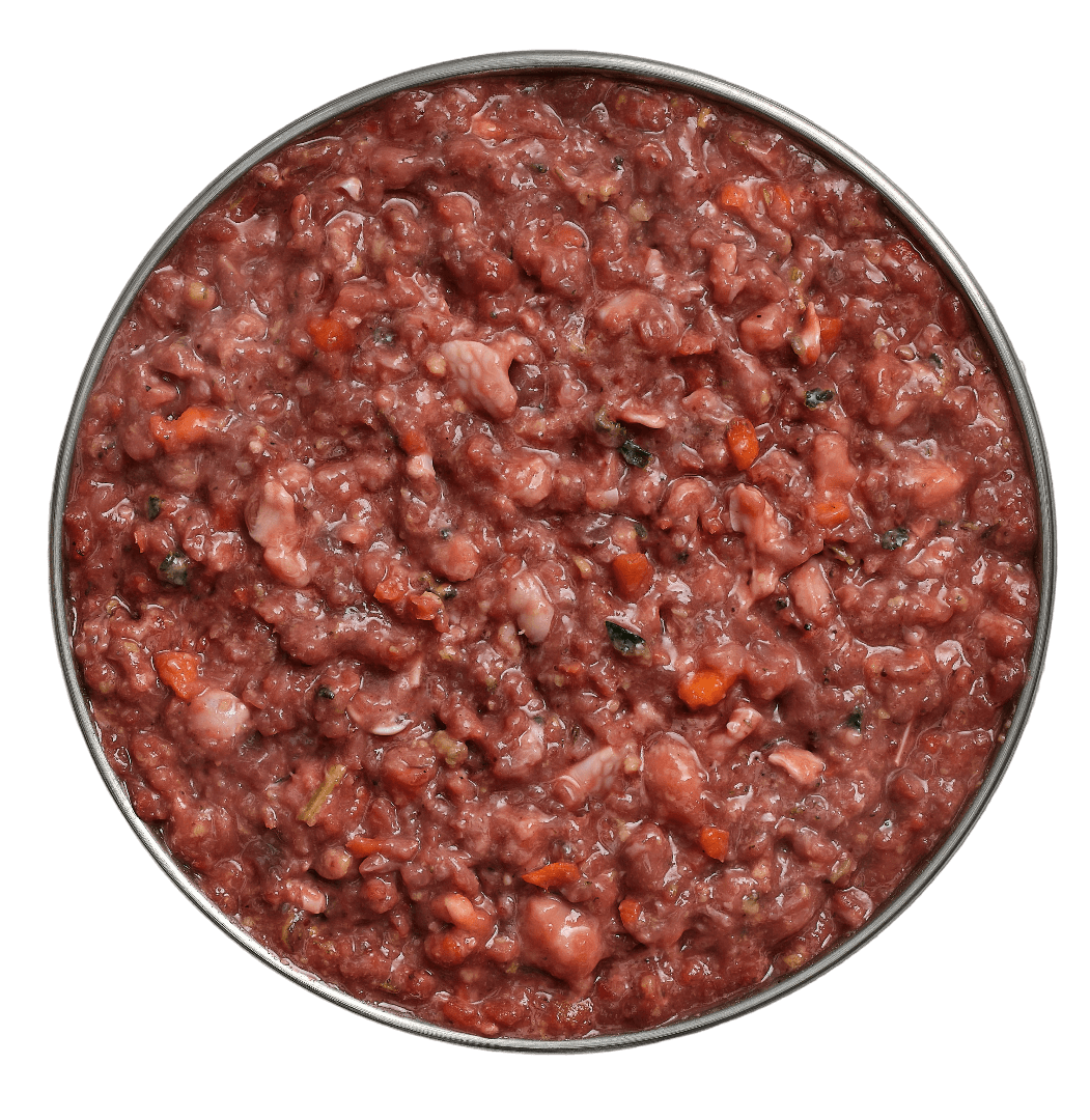 Chicken and/or Beef and/or Pork and/or Lamb (includes meat, finely ground bones and offal), Carrots, Apples, Salmon Frames, Yoghurt, Whole Eggs, Spinach and/or Silverbeet, Oranges, Cabbage, Alfalfa, Dehydrated Kelp, Flaxseed, Celery, Garlic, plus other assorted seasonal vegetables and /or fruits