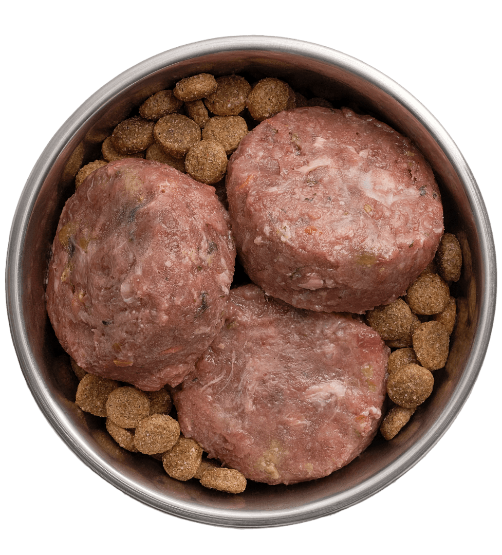 Kangaroo, Chicken, Beef (includes meat, finely ground bones and offal), Carrots, Apples, Whole Eggs, Salmon Frames, Yoghurt, Spinach and/or Silverbeet, Oranges, Cabbage, Alfalfa, Dehydrated Kelp, Flaxeed, Celery, Garlic, Natural Antioxidant, plus other Assorted Seasonal Vegetables and/or Fruits.