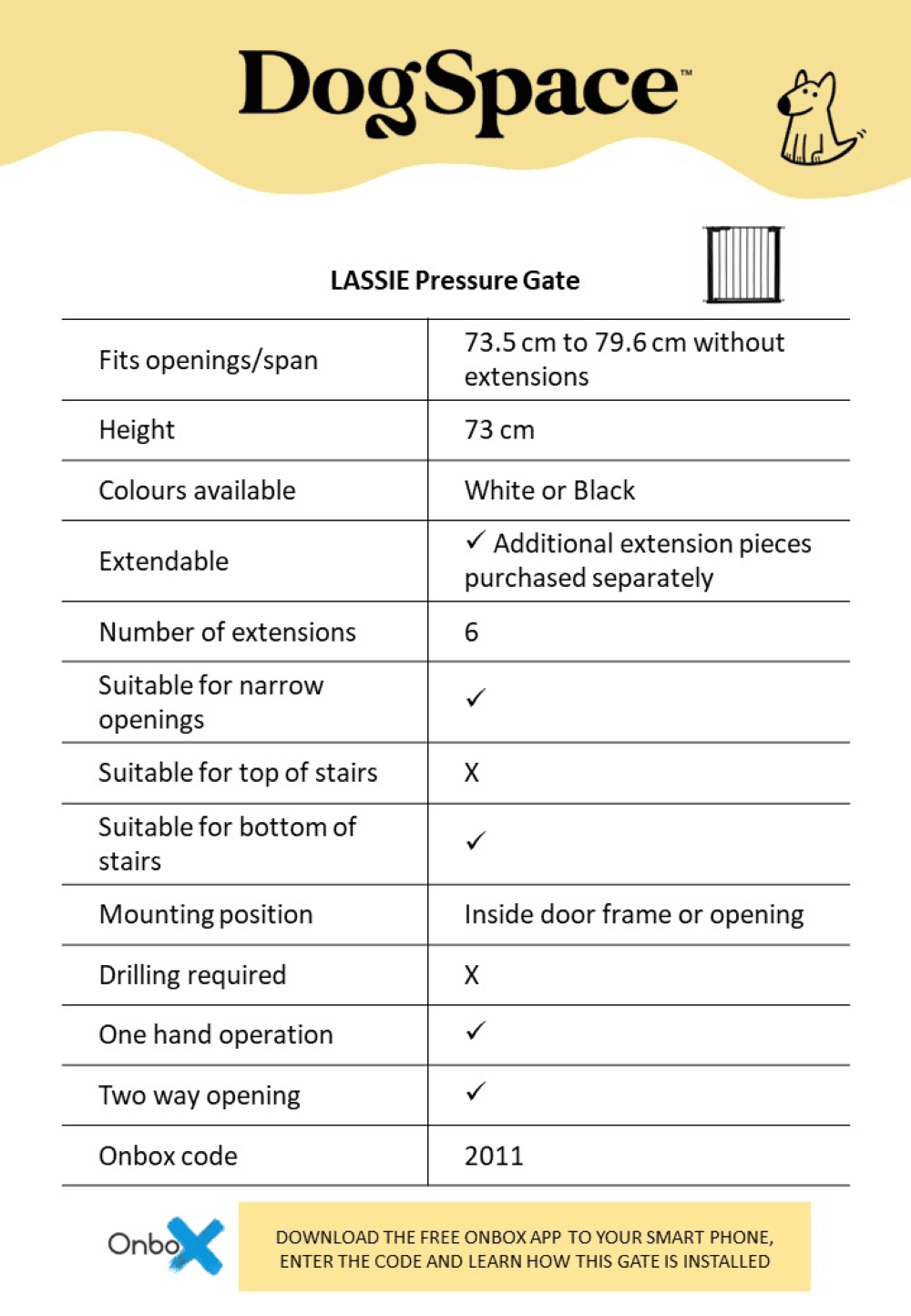 Unveil the ideal home solution with the DogSpace Lassie Safety Gate, a robust and versatile indoor pet barrier that ensures your furry friend?s safety. Engineered for durability, this pressure-fitted safety gate serves as both a pet boundary and a sophisticated addition to your home decor.
