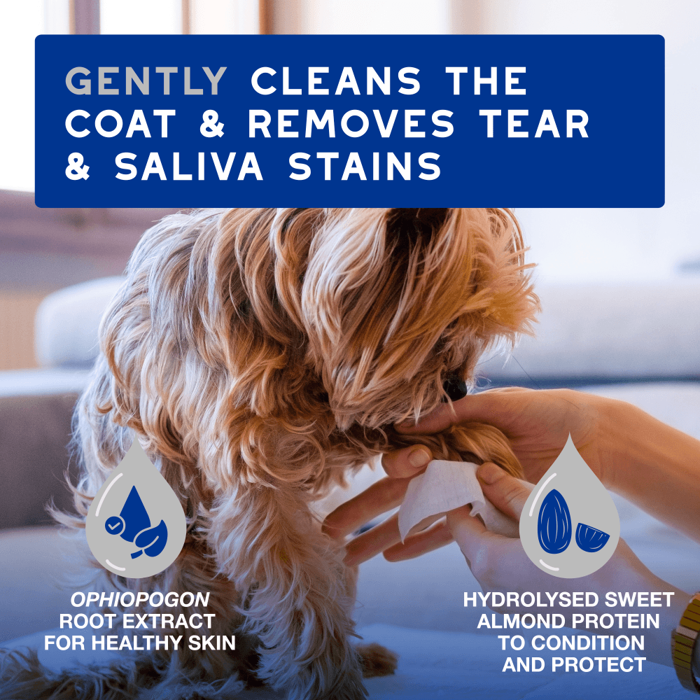 - These thick grooming wipes are excellent for easily wiping away tear stains, saliva marks, and general dirt from all areas of your pet's body