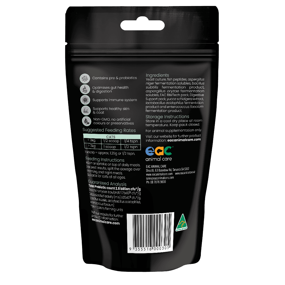 EAC's In-SideOut Cat Pre & Probiotic supplement elevates your cat's health by supporting digestive, intestinal, and immune function. This holistic formula is crafted to enhance your feline friend's overall well-being. Just sprinkle over or mix into your pets food too easy!