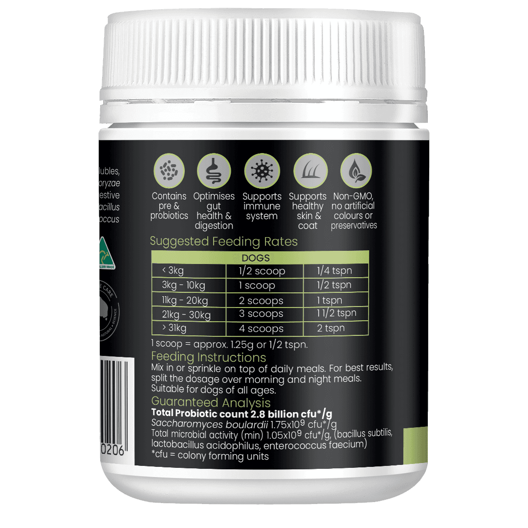 Yeast culture dried, Aspergillus nigerfermentation solubles dried, Bacillus subtilis fermentation product dried, Aspergillus oryzae fermentation solubles, Yuccaschidigera extract dried, Lactobacillus acidophilus fermentation product dried, Enterococcus faecium fermentation product, Macleaya, Cordata Extract, Digestive Enzymes, Mushroom Extract, Nucleotides. Concentration of probiotics: 350 million CFU/g