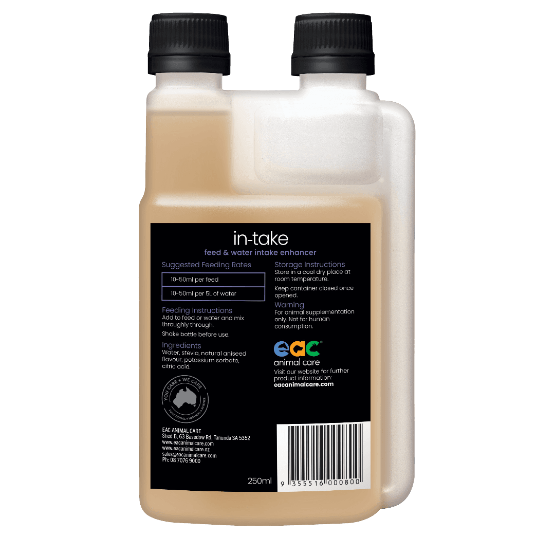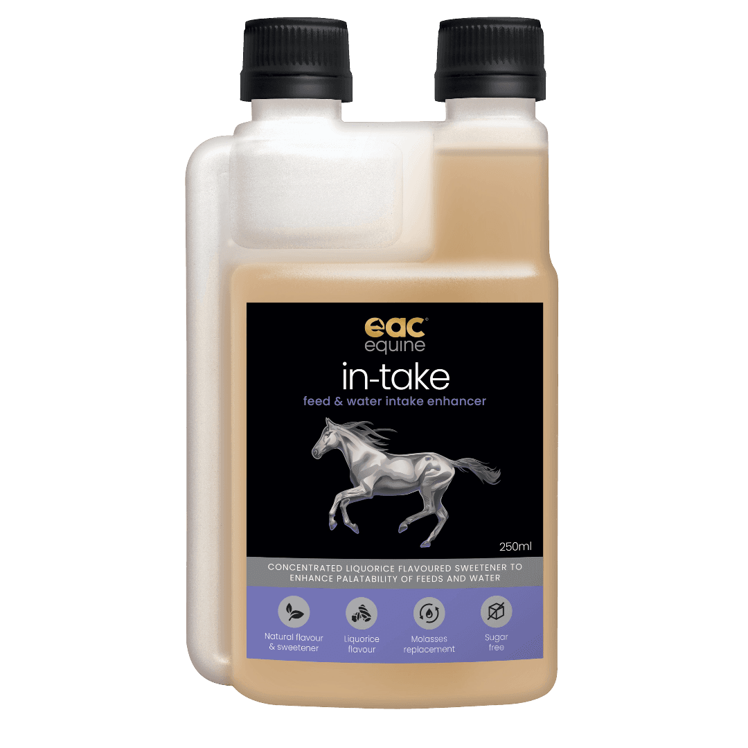 EAC In-Take Feed and Water Enhancer Horse Supplement is designed to encourage increased feed and water intake by using natural flavors. Ideal for fussy eaters or when masking medication, this supplement promotes better hydration and nutrition for your horse.