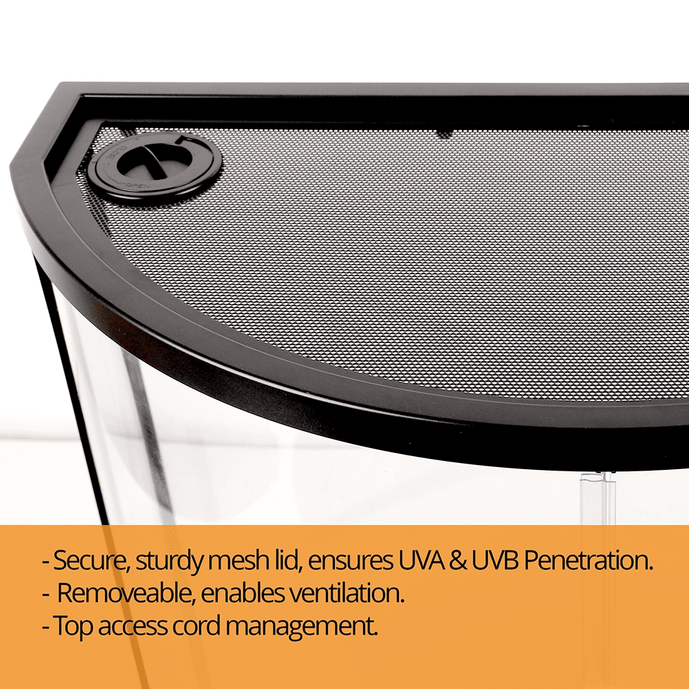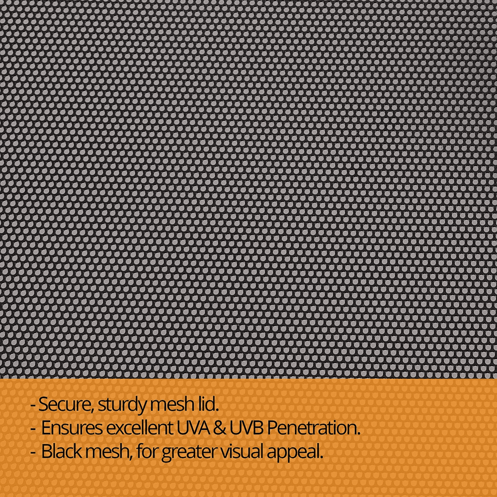 - A secure mesh top is included, ensuring optimal ventilation and serving as a convenient platform for installing essential lighting, heating, and UVB equipment