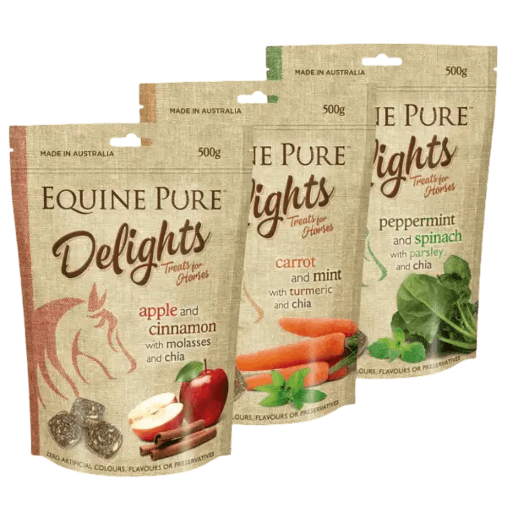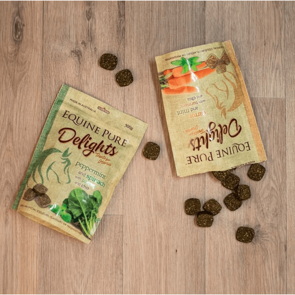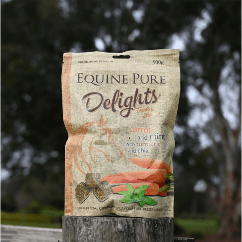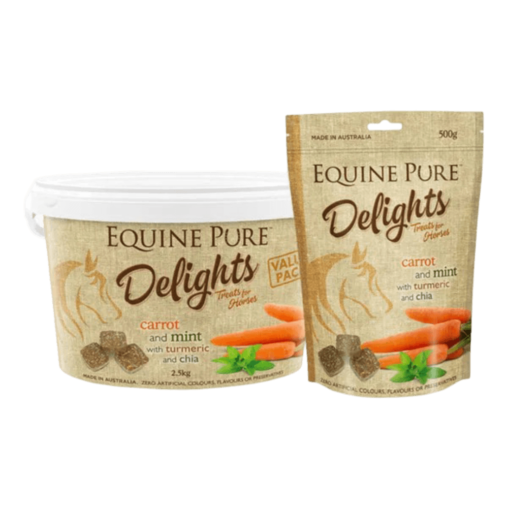 Equine Pure Delights Carrot & Mint with Turmeric & Chia are wholesome, all-natural horse treats that blend crunchy carrots, refreshing mint, anti-inflammatory turmeric and omega-rich chia. Soft and easy to chew, they're a nutritious reward or everyday snack for horses and ponies of all ages.