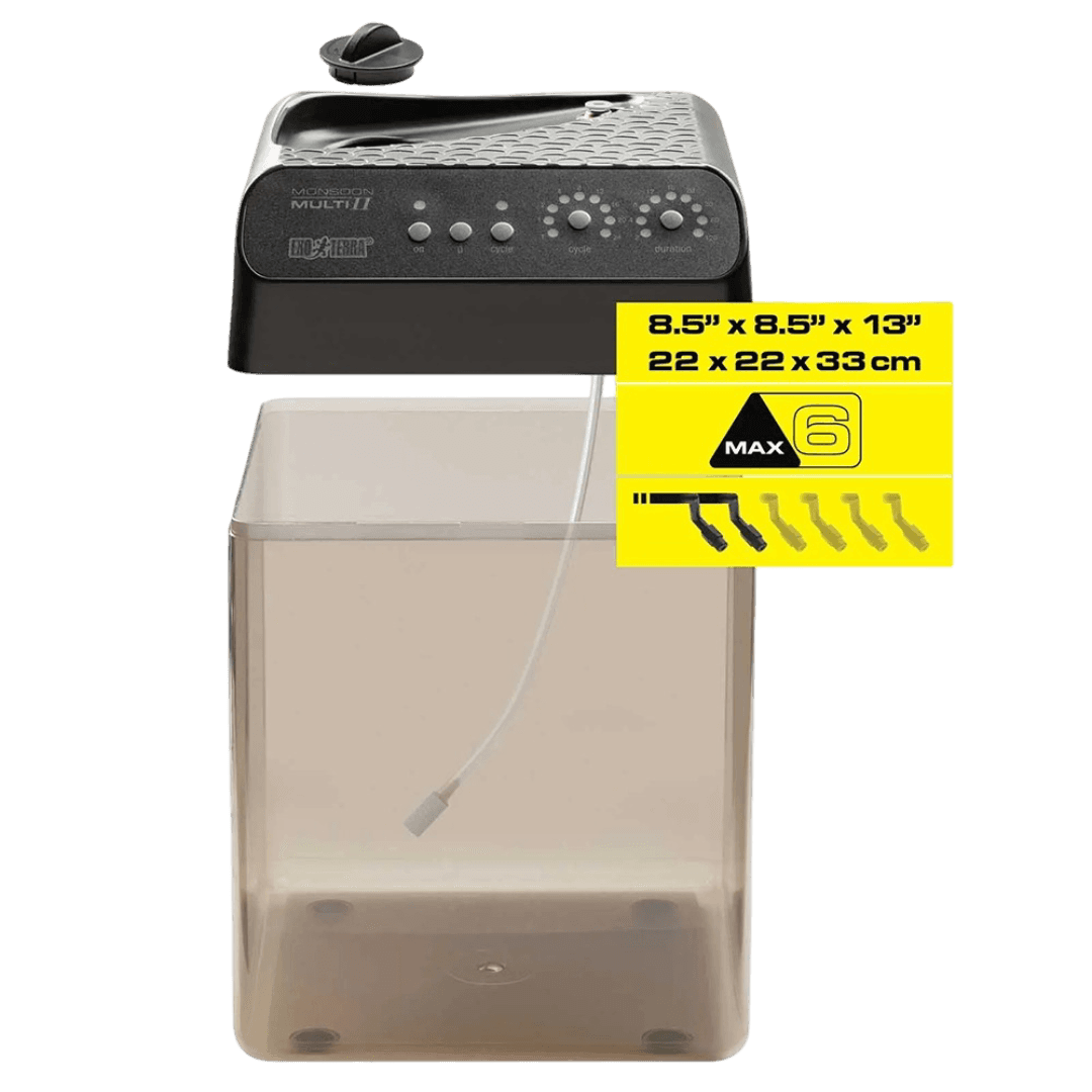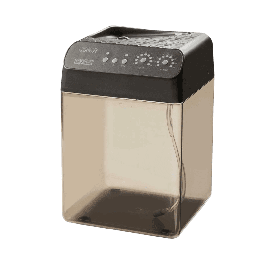 The Exo Terra Monsoon Multi II Reptile Mister is a programmable, automatic misting unit designed to maintain optimal humidity levels in all types of terrariums and greenhouses. It provides a finely dispersed mist at easily adjustable intervals, which is essential for the health of your tropical pets and the growth of live plants.