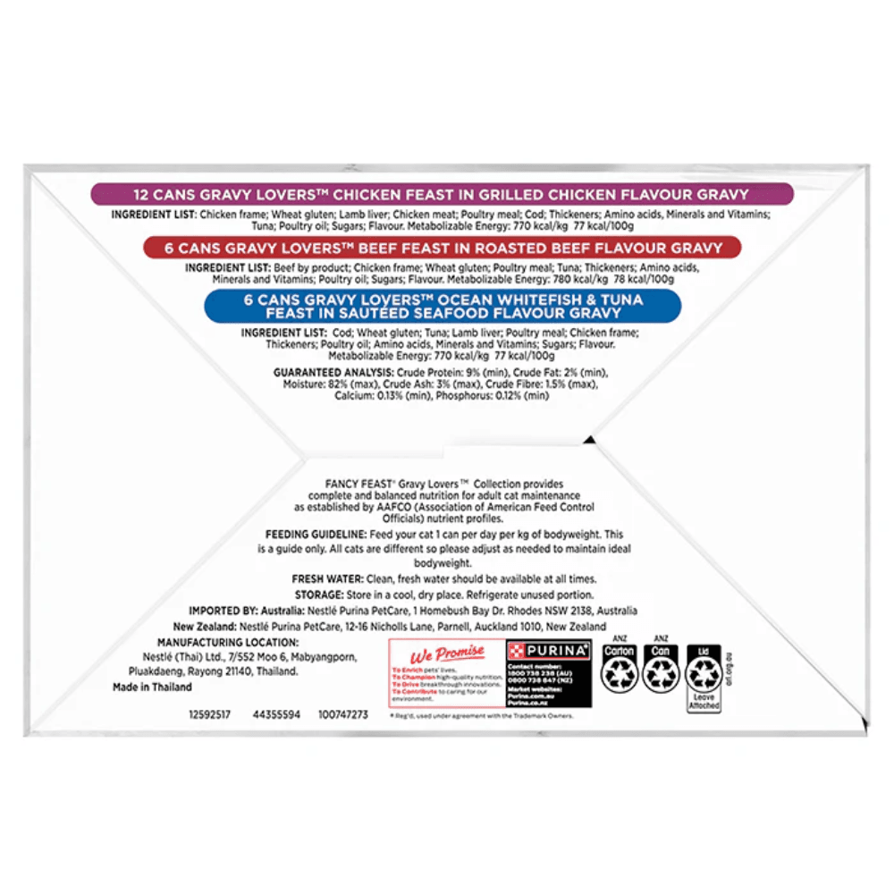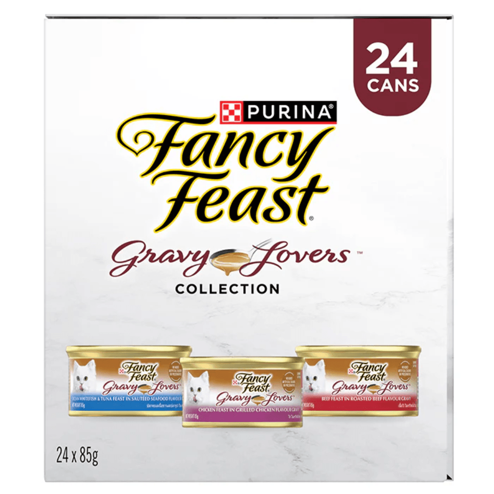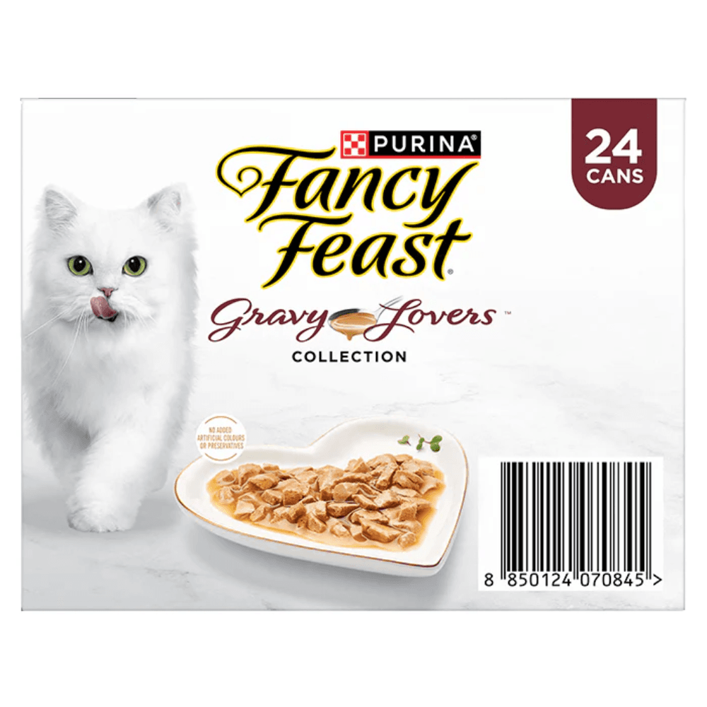 The Fancy Feast Gravy Lovers Collection Variety Pack Wet Cat Food Cans provides a selection of gourmet recipes featuring tender pieces of meat and fish slow-cooked in a rich, savoury gravy. This variety pack offers a nutritionally complete and balanced diet designed to satisfy the cravings of feline gravy enthusiasts while supporting their overall health.