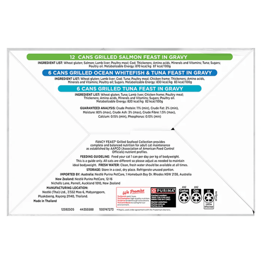 The Fancy Feast Grilled Seafood Collection Variety Pack Wet Cat Food Cans offers a selection of gourmet recipes featuring tender, slow-cooked seafood cuts in a savoury gravy. This premium assortment ensures your cat enjoys a diverse rotation of high-quality proteins while meeting all their daily nutritional requirements.