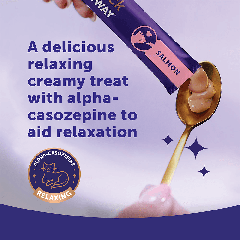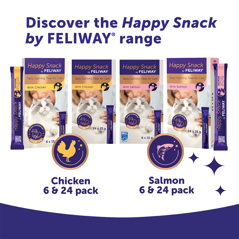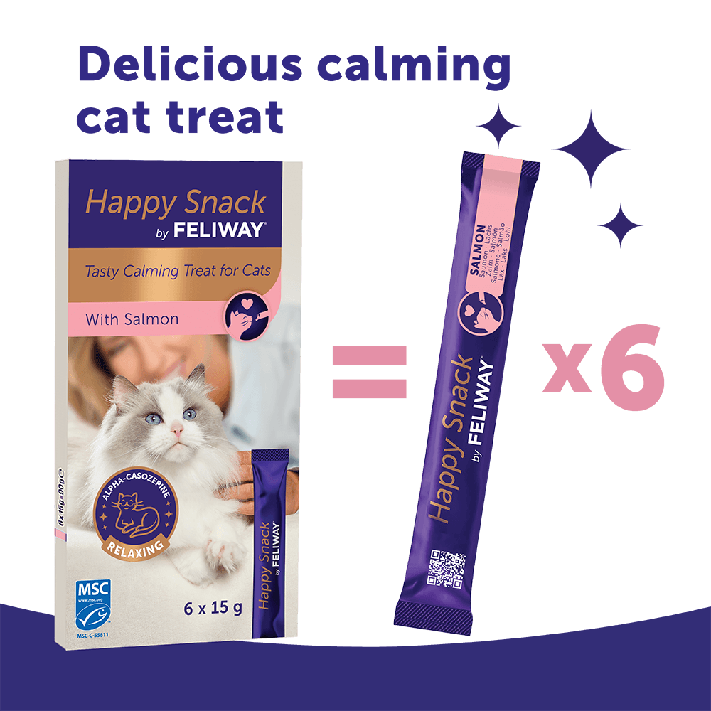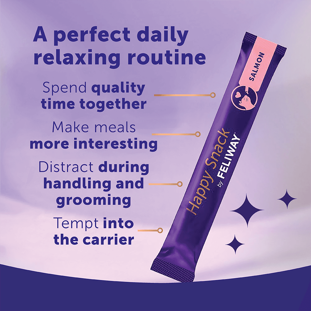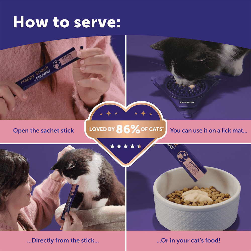 - Using Feliway Happy Snack Salmon Calming Lickable Cat Treats provides a positive distraction and bonding moment between you and your pet during tense situations