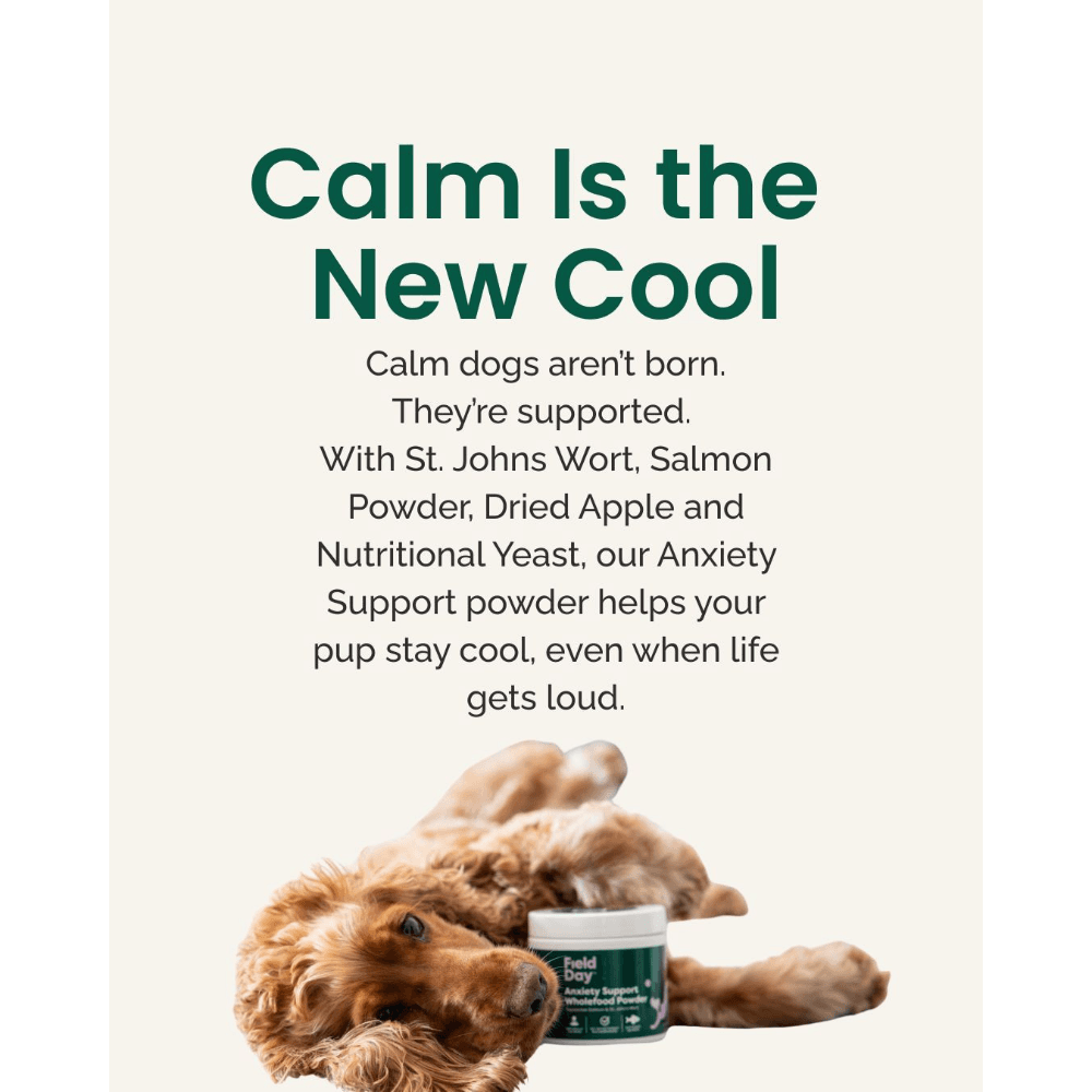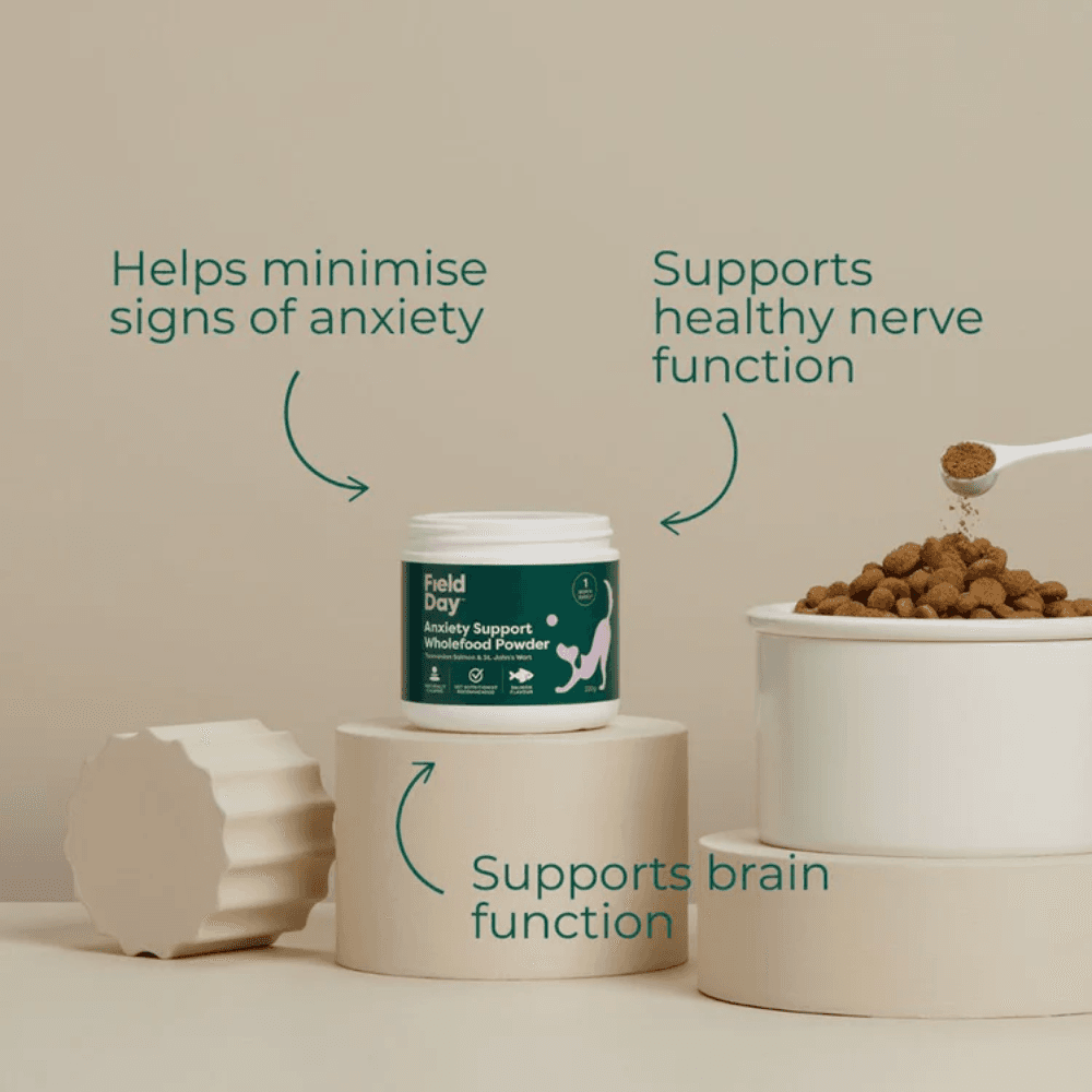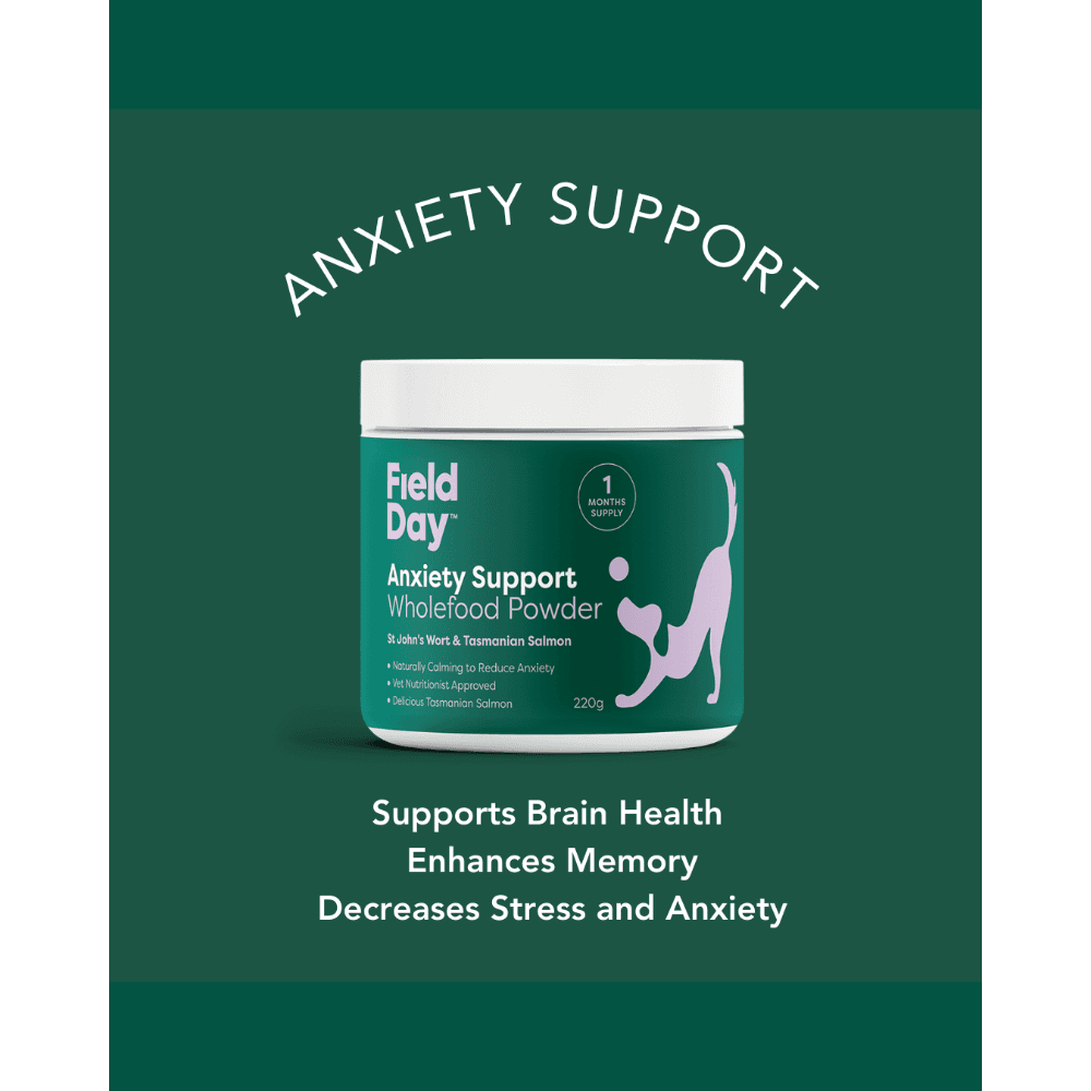 Calm Their Nerves Naturally The Zen Your Dog Deserves! Does your dog get a little too anxious about the unknown? Or maybe your senior pooch is starting to forget where they hid that toy? Field Days Anxiety Support Wholefood Powder is here to save the day (and your dogs sanity)! Packed with brain-boosting, stress-busting ingredients, this powder is like a warm hug in a scoop for your four-legged friend. Say goodbye to nerves and hello to calm, happy vibes! Just sprinkle over or mix into your pet's foodtoo easy!