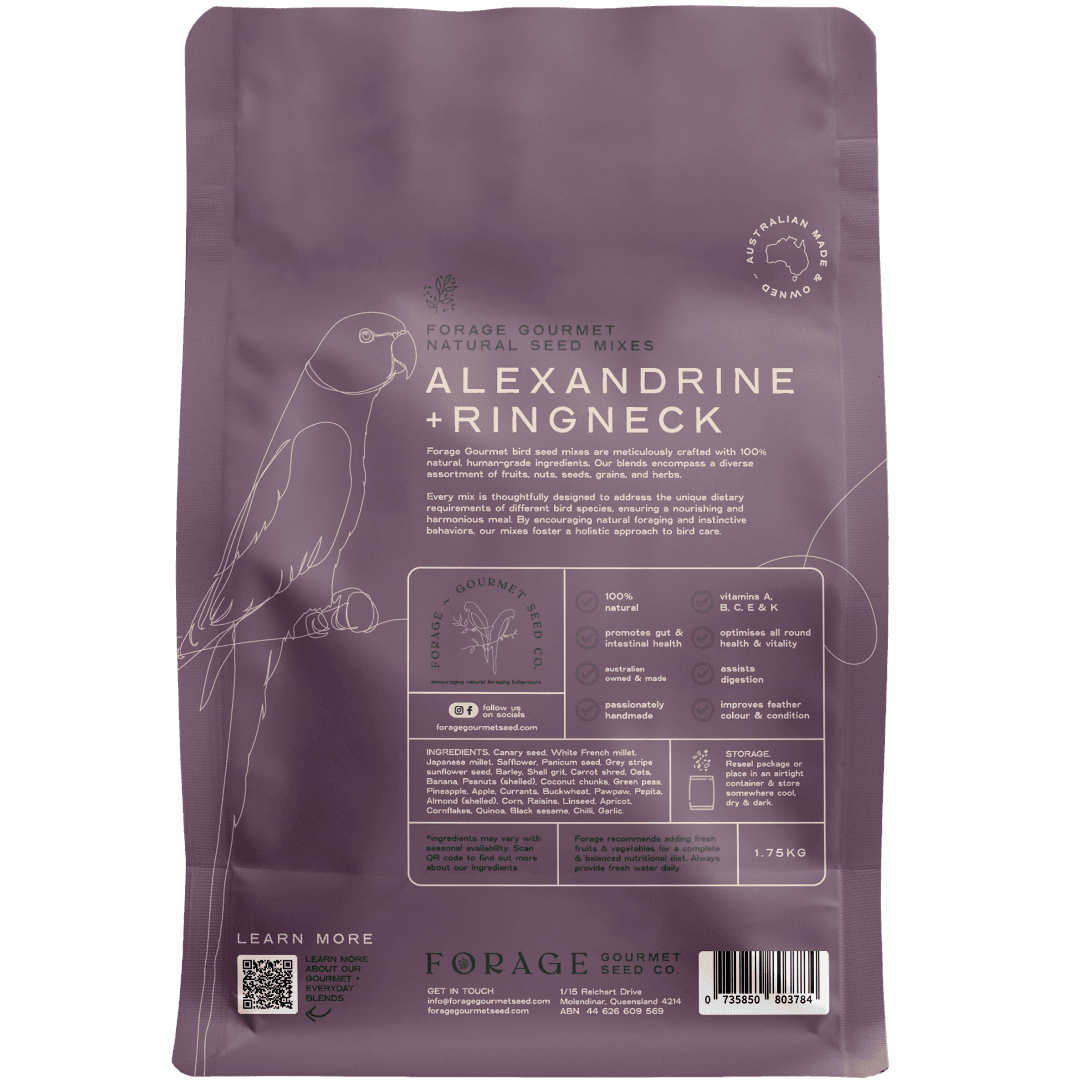 The Forage Forage Gourmet Alexandrinne And Ringneck Bird Food is a premium, nutrient-rich seed blend specifically formulated to support the health and happiness of seed-loving medium parrots like Ringnecks and Alexandrines. This high-quality mix is packed with natural seeds, wholesome grains, vibrant fruits, and essential nutrients, designed to encourage natural foraging behaviours and boost your bird's overall vitality.