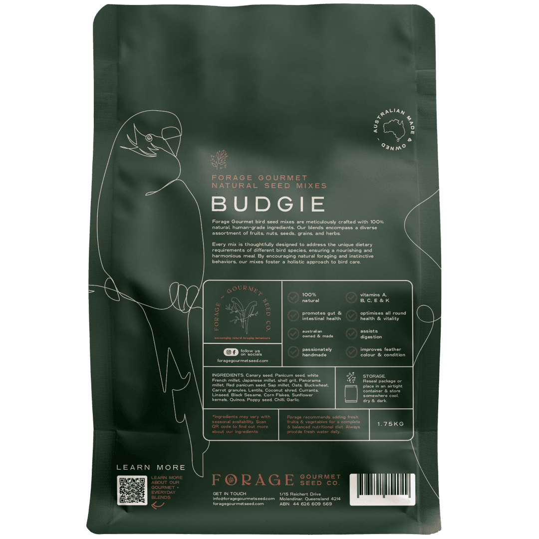 - By offering flavour, texture, and enrichment in every bite, the Forage Gourmet For Budgies Bird Food supports the bird's natural instincts and overall happiness