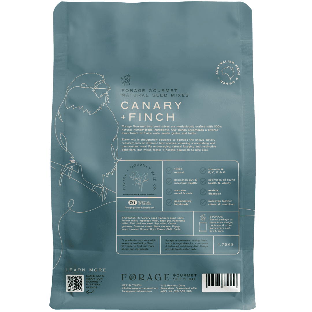 The Forage Forage Gourmet For Canary And Finch Bird Food is a premium seed mix specifically formulated to meet the nutritional needs of small pet birds. This expertly crafted blend provides a rich variety of seeds, grains, and natural additions like chili and coconut to support overall health and stimulate natural foraging behaviour.