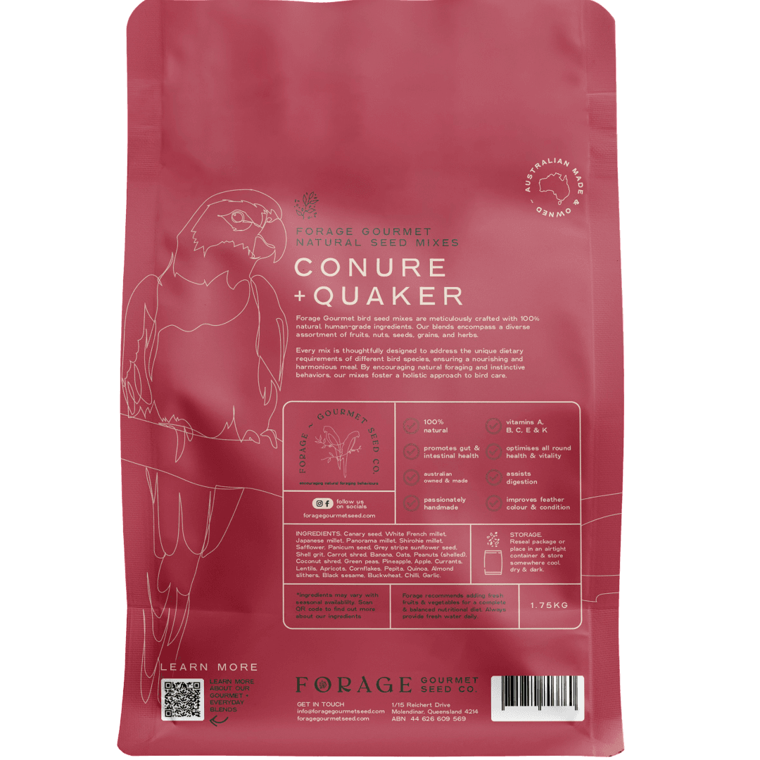 The Forage Forage Gourmet For Conure And Quaker Bird Food is a premium, nutritionally complete seed blend made with 100% human-grade, natural ingredients to support the health and vitality of your bird. This vibrant, diverse mix is expertly crafted to cater to the specific dietary needs of conures and quakers while encouraging their natural foraging behaviours.