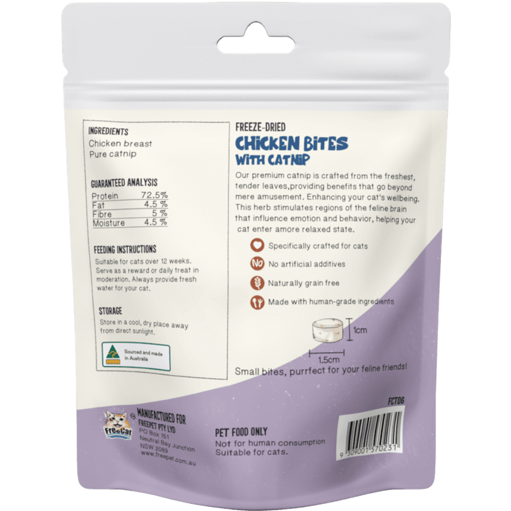 - Freecat Freeze Dried Chicken Bites With Catnip Cat Treats contain no artificial colours, flavours, or preservatives to ensure a clean dietary addition