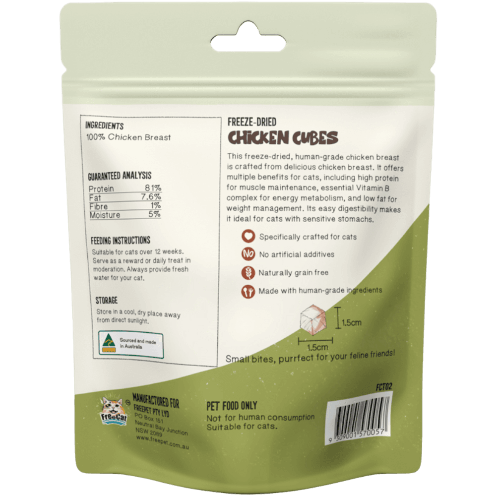 Freecat Freeze Dried Chicken Cubes Cat Treats are a premium, single-ingredient snack crafted from 100% human-grade chicken breast to support your feline’s health. These nutrient-dense cubes provide a high-protein boost in a texture that cats naturally crave, making them an ideal choice for rewarding your pet.