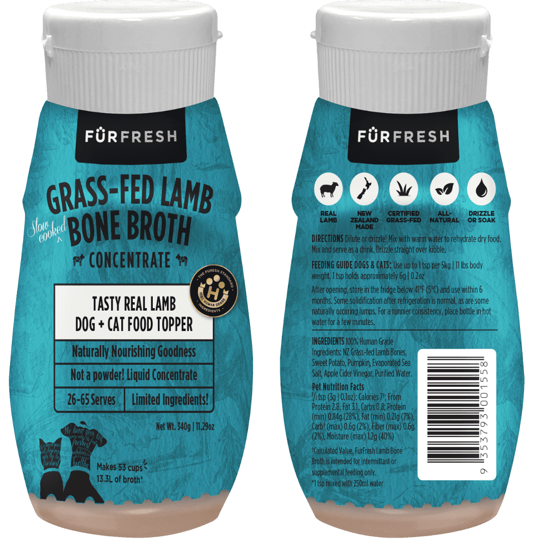 - The Furfresh Lamb Bone Broth Concentrate Meal Topper For Dogs And Cats is made from 100% human-grade, grass-fed lamb bones without artificial flavours