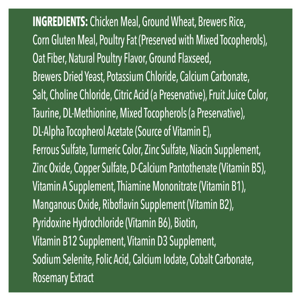 Chicken Meal, Ground Wheat Brewers Rice Corn Gluten Meal, Poultry Fat (Preserved with Mixed Tocopherols), Oat Fiber, Natural Poultry Flavor, Ground Flaxseed Brewers Dried Yeast, Potassium Chloride, Calcium Carbonate, Salt, Choline Chloride, Citric Acid (a Preservative), Fruit Juice Color, Taurine, DL-Methionine, Mixed Tocopherols (a Preservative), DL-Alpha Tocopherol Acetate (Source of Vitamin E), Ferrous Sulfate, Turmeric Color, Zinc Sulfate, Niacin Supplement, Zinc Oxide, Copper Sulfate, D-Calcium Pantothenate (Vitamin B5), Vitamin A Supplement, Thiamine Mononitrate (Vitamin B1), Manganous Oxide, Riboflavin Supplement (Vitamin B2), Pyridoxine Hydrochloride (Vitamin B6), Biotin, Vitamin B12 Supplement, Vitamin D3 Supplement, Sodium Selenite, Folic Acid, Calcium Iodate, Cobalt Carbonate, Rosemary Extract
