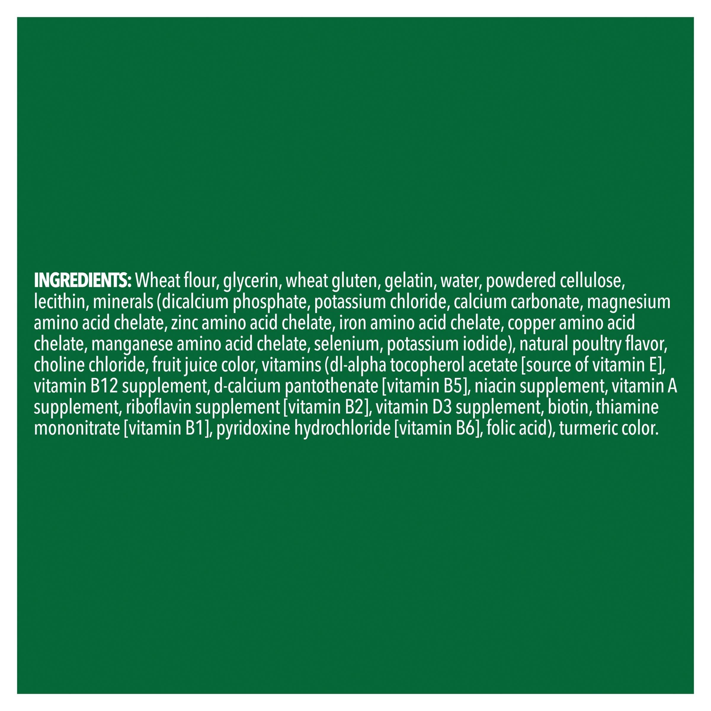 Wheat flour, glycerin, wheat gluten, gelatin, water, powdered cellulose, lecithin, minerals (dicalcium phosphate, potassium chloride, calcium carbonate, magnesium amino acid chelate, zinc amino acid chelate, iron amino acid chelate, copper amino acid chelate, manganese amino acid chelate, selenium, potassium iodide), natural poultry flavour, choline chloride, fruit juice colour, vitamins (dl-alpha tocopherol acetate [source of vitamin E], vitamin B12 supplement, d-calcium pantothenate [vitamin B5], niacin supplement, vitamin A supplement, riboflavin supplement [vitamin B2], vitamin D3 supplement, biotin, thiamine mononitrate [vitamin B1], pyridoxine hydrochloride [vitamin B6], folic acid), turmeric colour.