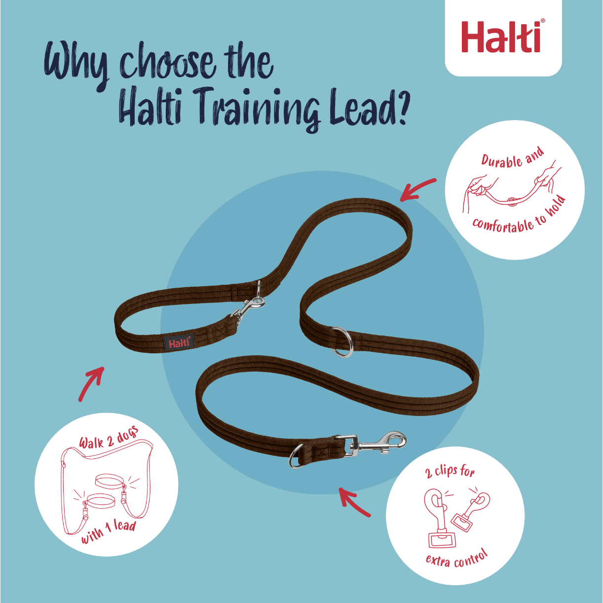 The Halti Training Dog Lead in Deep Walnut is a highly versatile and practical lead designed to enhance control and simplify training for both dogs and owners. With its multi-functional design, soft padded material, and dual clips, it's perfect for a variety of walking and training scenarios.