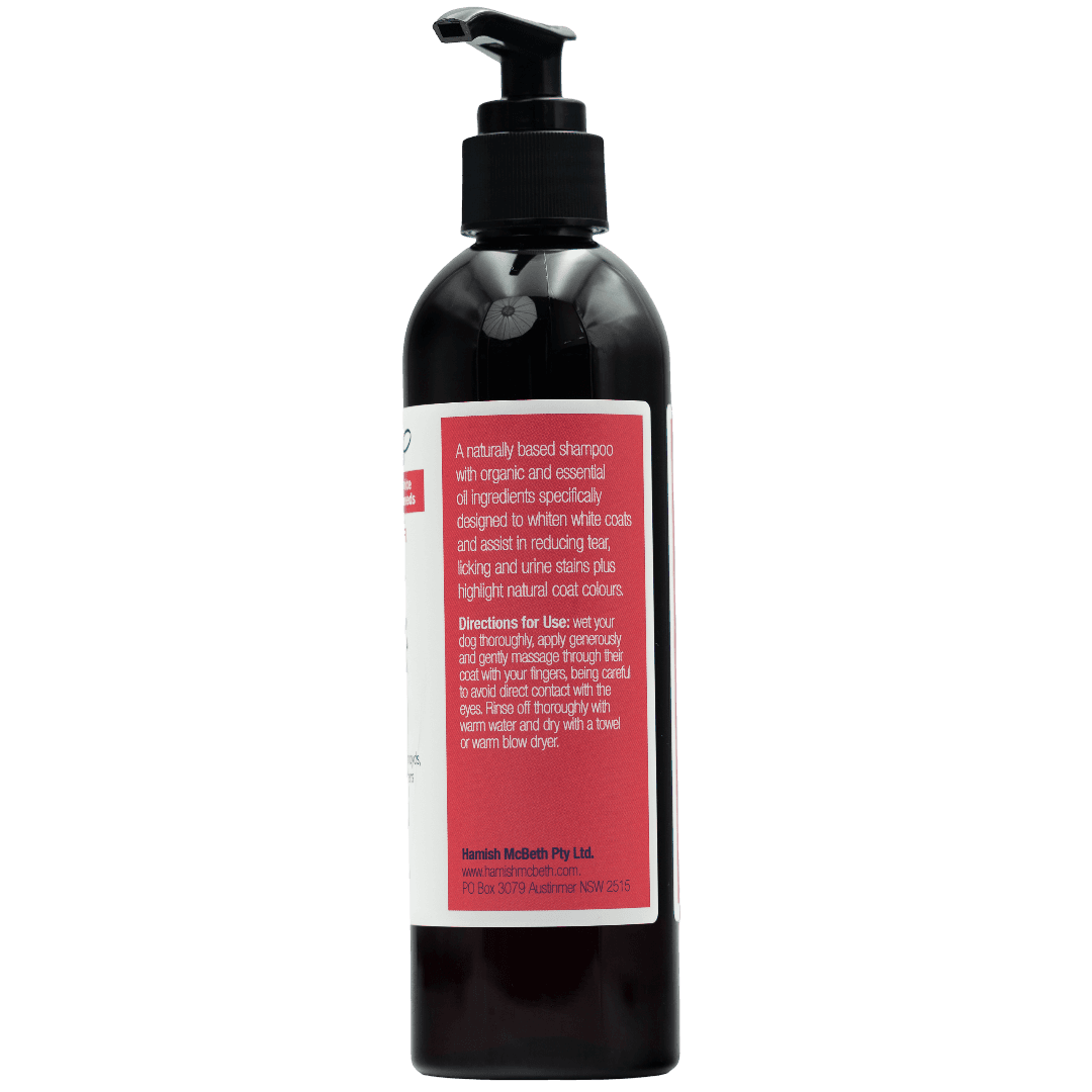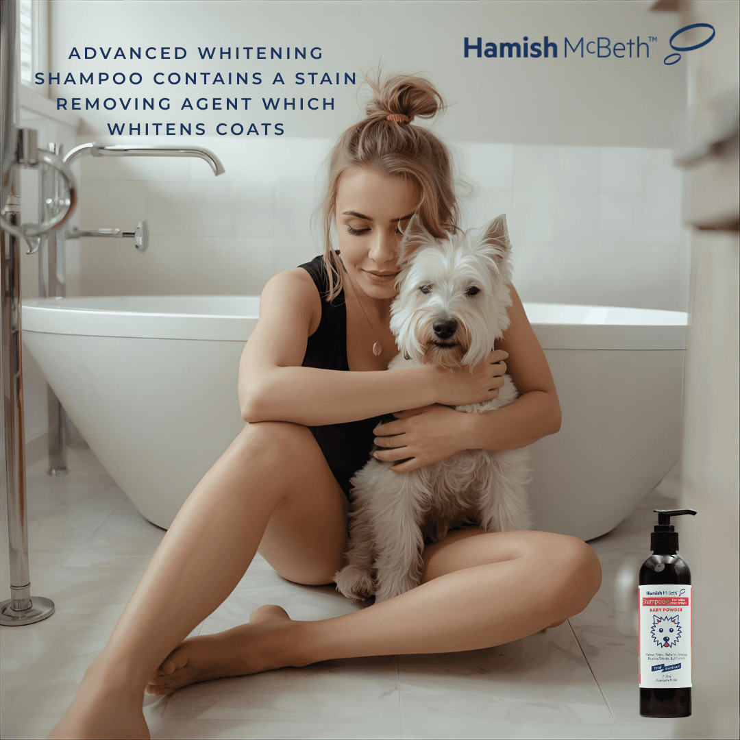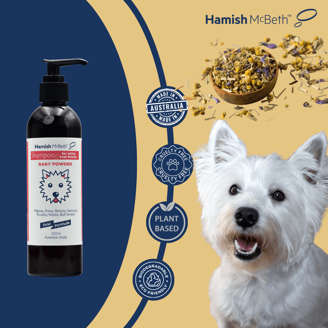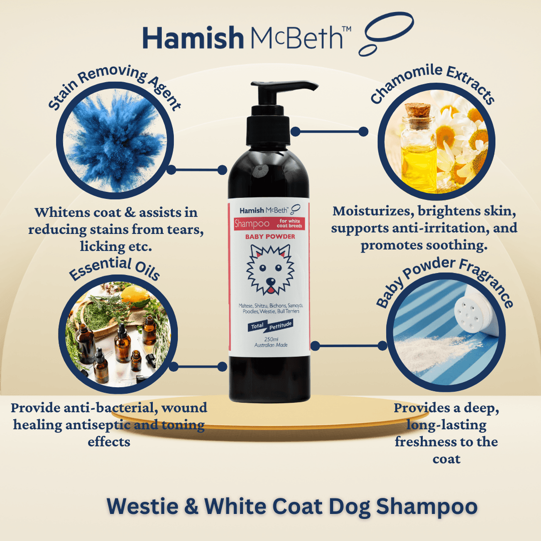Hamish McBeth's Westie & White Coat Natural Baby Powder dog'shampoo is a whitening shampoo and conditioner designed for Westies and other white or light-coated breeds. It features a vibrant Baby Powder fragrance and a blue-tinted formula that lifts stains while deeply cleansing without leaving residue, and contains no soap, phosphates or parabens.
