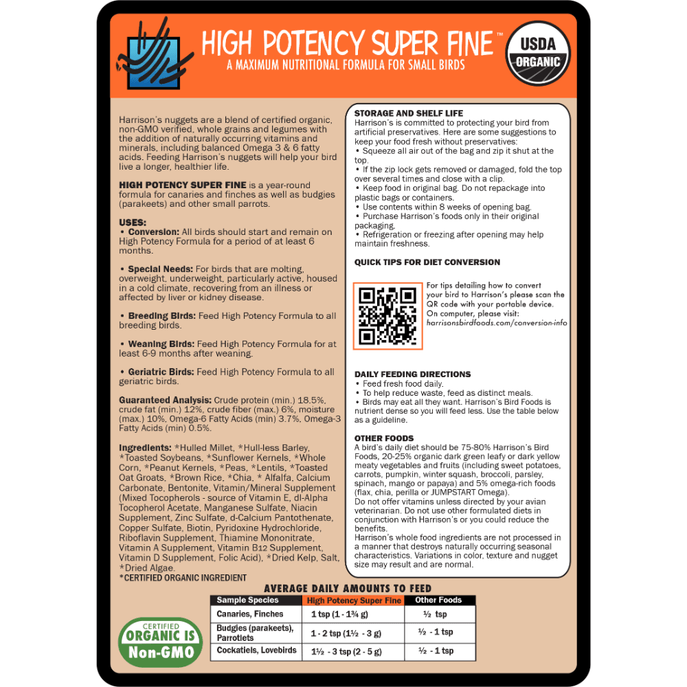 Harrisons High Potency Super Fine Bird Food is a premium blend of certified organic, non-GMO verified, whole grains and legumes, fortified with naturally occurring vitamins, minerals, and balanced Omega 3 & 6 fatty acids