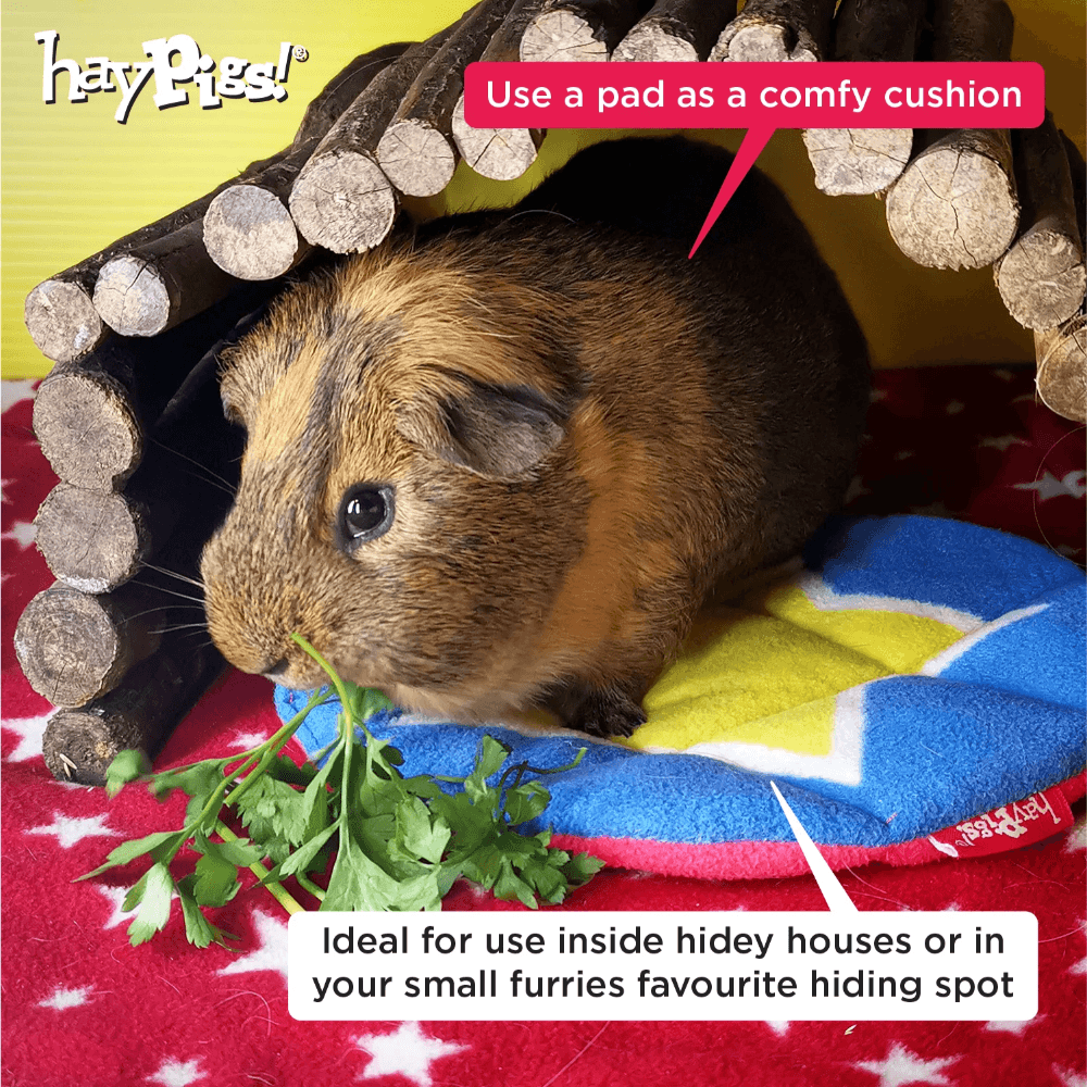 These HayPigs!® Pee Pads are a pack of two super-soft, cushioned, and absorbent pads, designed to be compatible with the HayPigs!® Circus Hidey Hut™; They provide a comfortable and hygienic surface for small pets.
