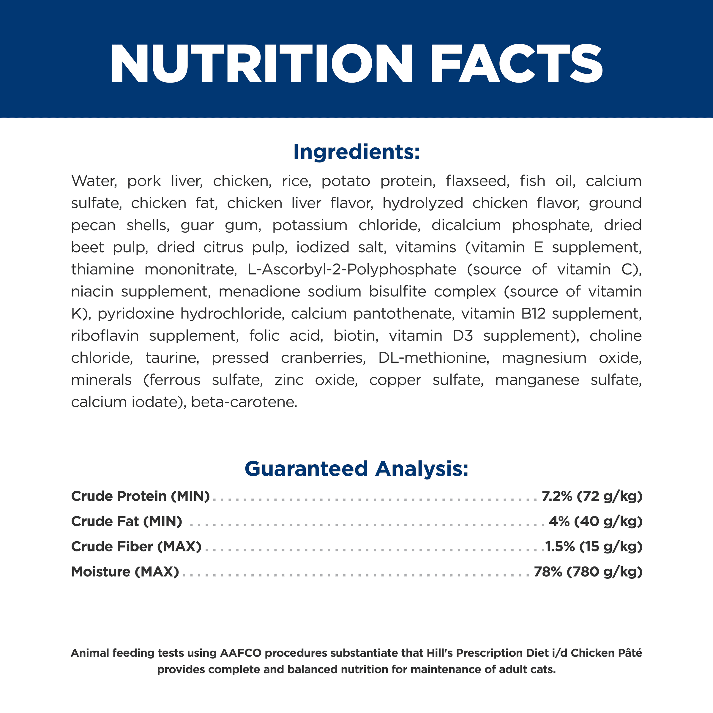 Water, Pork Liver, Chicken, Rice, Potato Protein, Flaxseed, Fish Oil, Calcium Sulfate, Chicken Fat, Chicken Liver Flavor, Hydrolyzed Chicken Flavor, Ground Pecan Shells, Guar Gum, Potassium Chloride, Dicalcium Phosphate, Dried Beet Pulp, Dried Citrus Pulp, Iodized Salt, vitamins (Vitamin E Supplement, Thiamine Mononitrate, L-Ascorbyl- 2-Polyphosphate (source of Vitamin C), Niacin Supplement, Menadione Sodium Bisulfite Complex (source of Vitamin K), Pyridoxine Hydrochloride, Calcium Pantothenate, Vitamin B12 Supplement, Riboflavin Supplement, Folic Acid, Biotin, Vitamin D3 Supplement), Choline Chloride, Taurine, Pressed Cranberries, DL-Methionine, Magnesium Oxide, minerals (Ferrous Sulfate, Zinc Oxide, Copper Sulfate, Manganese Sulfate, Calcium Iodate), Beta-Carotene