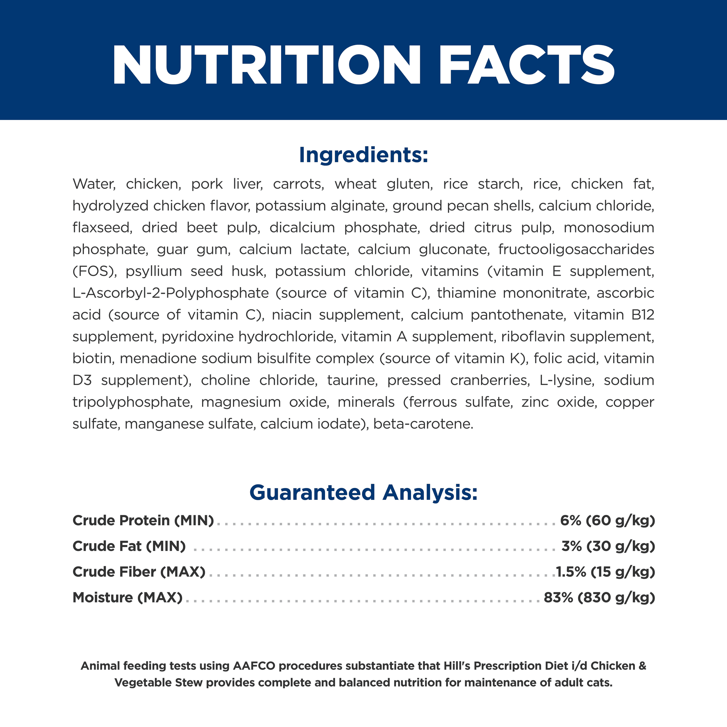 Water, Chicken, Pork Liver, Carrots, Wheat Gluten, Rice Starch, Rice, Chicken Fat, Hydrolyzed Chicken Flavor, Potassium Alginate, Ground Pecan Shells, Calcium Chloride, Flaxseed, Dried Beet Pulp, Dicalcium Phosphate, Dried Citrus Pulp, Monosodium Phosphate, Guar Gum, Calcium Lactate, Calcium Gluconate, Fructooligosaccharides (FOS), Psyllium Seed Husk, Potassium Chloride, vitamins (Vitamin E Supplement, L-Ascorbyl-2-Polyphosphate (source of Vitamin C), Thiamine Mononitrate, Ascorbic Acid (source of Vitamin C), Niacin Supplement, Calcium Pantothenate, Vitamin B12 Supplement, Pyridoxine Hydrochloride, Vitamin A Supplement, Riboflavin Supplement, Biotin, Menadione Sodium Bisulfite Complex (source of Vitamin K), Folic Acid, Vitamin D3 Supplement), Choline Chloride, Taurine, Pressed Cranberries, L-Lysine, Sodium Tripolyphosphate, Magnesium Oxide, minerals (Ferrous Sulfate, Zinc Oxide, Copper Sulfate, Manganese Sulfate, Calcium Iodate), Beta-Carotene