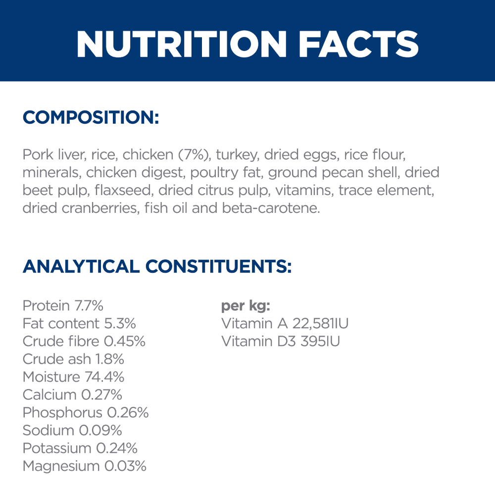 Meat and animal derivatives (chicken 7%), cereals, eggs and egg derivatives, minerals, derivatives of vegetable origin, oils and fats, seeds, fruit. Highly digestible ingredients: Pork liver, rice, chicken, turkey, dried eggs, rice flour, fish oil. ActivBiome+ Digestion prebiotic blend (1.4%): Ground pecan shell, dried beet pulp, flaxseed, dried citrus pulp, dried cranberries.