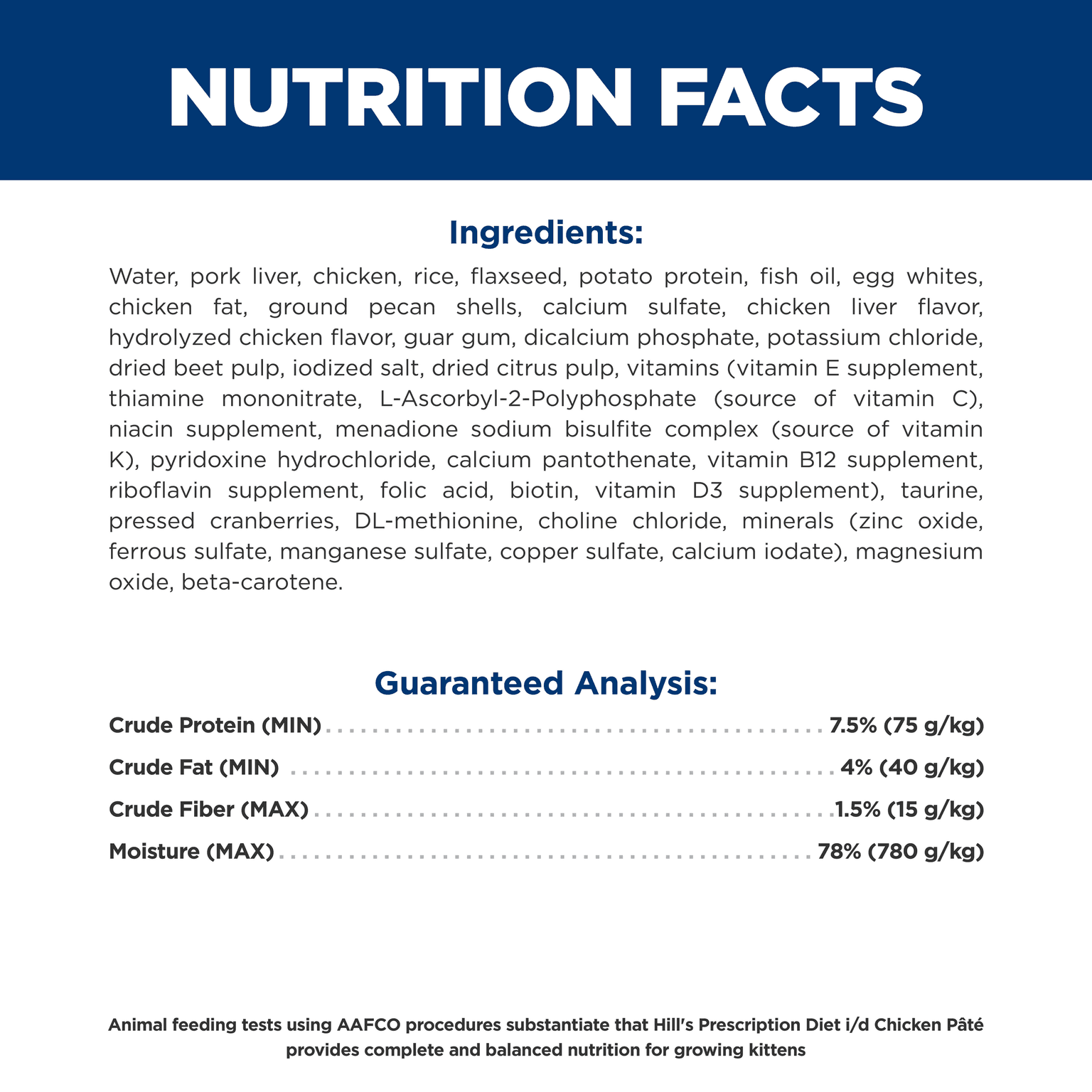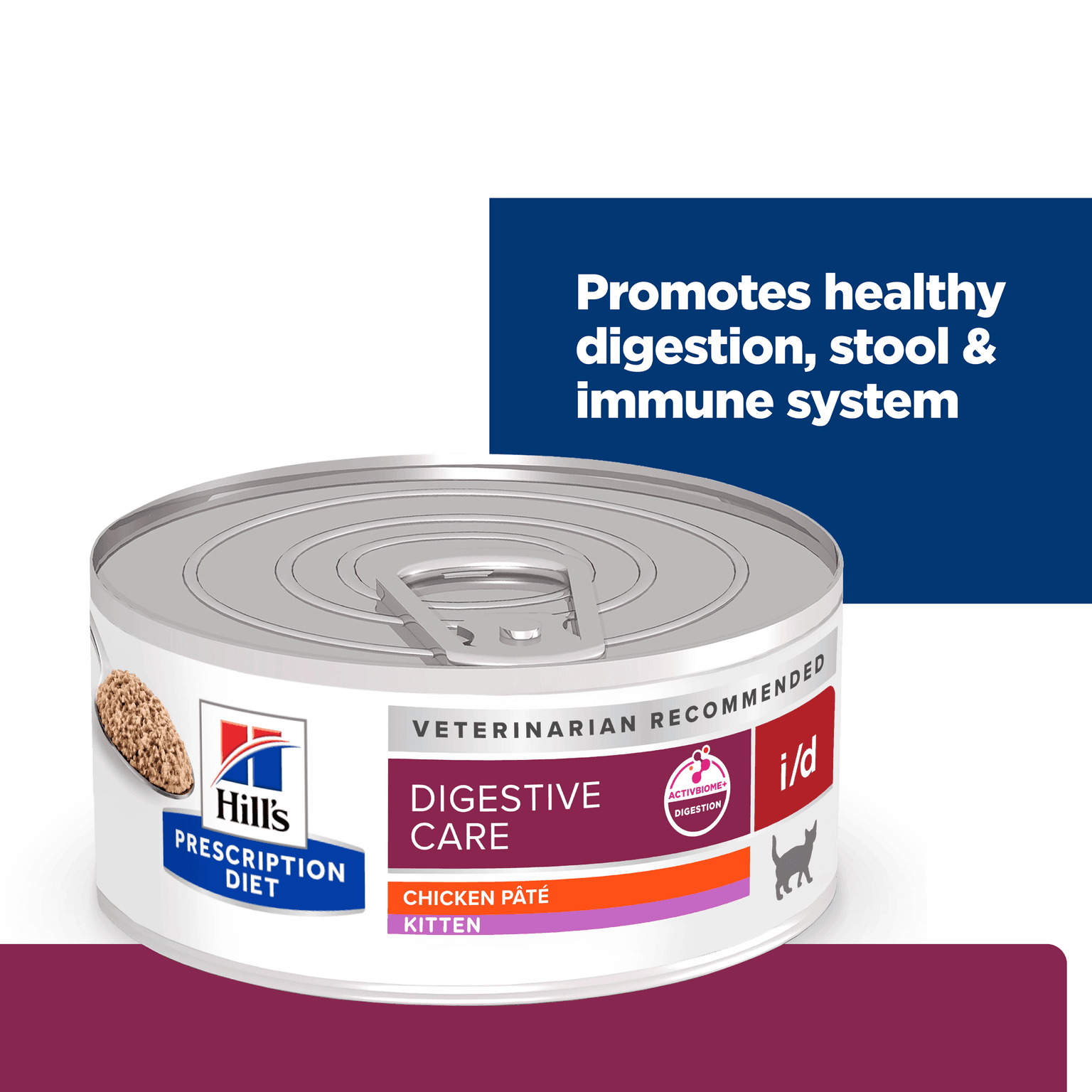 Hill's Prescription Diet i/d Kitten Canned Cat Food offers highly digestible clinical nutrition specifically formulated to support digestive health and manage upsets in growing kittens. This formula promotes easy nutrient absorption while meeting the complete nutritional requirements for healthy development.
