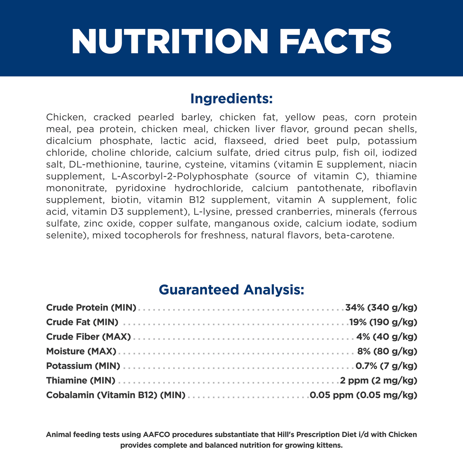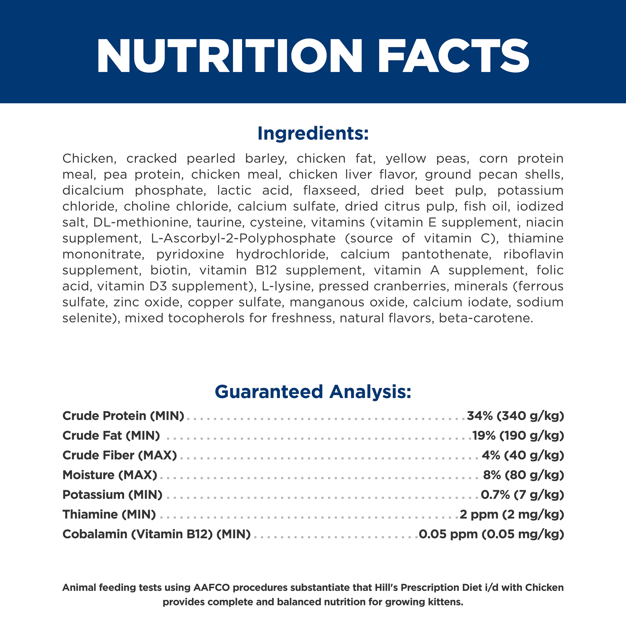 Chicken, cracked pearled barley, chicken fat, yellow peas, corn protein meal, pea protein, chicken meal, chicken liver flavor, ground pecan shells, dicalcium phosphate, lactic acid, flaxseed, dried beet pulp, potassium chloride, choline chloride, calcium sulfate, dried citrus pulp, fish oil, iodized salt, DL-methionine, taurine, cysteine, vitamins (vitamin E supplement, niacin supplement, L-Ascorbyl-2-Polyphosphate (source of vitamin C), thiamine mononitrate, pyridoxine hydrochloride, calcium pantothenate, riboflavin supplement, biotin, vitamin B12 supplement, vitamin A supplement, folic acid, vitamin D3 supplement), L-lysine, pressed cranberries, minerals (ferrous sulfate, zinc oxide, copper sulfate, manganous oxide, calcium iodate, sodium selenite), mixed tocopherols for freshness, natural flavors, beta-carotene.