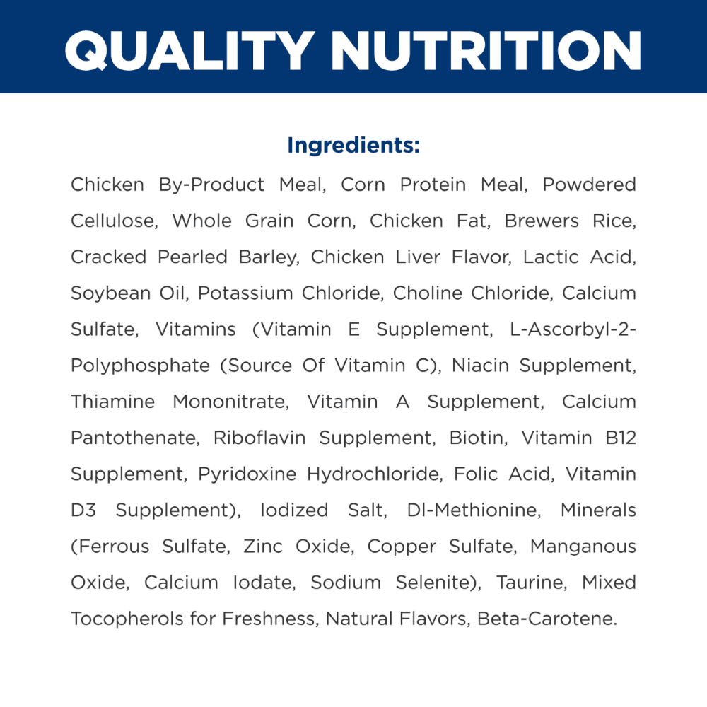 Chicken Liver Flavor, Lactic Acid, Soybean Oil, Potassium Chloride, Choline Chloride, Calcium Sulfate, vitamins (Vitamin E Supplement, L-Ascorbyl-2-Polyphosphate (source of Vitamin C), Niacin Supplement, Thiamine Mononitrate, Vitamin A Supplement, Calcium Pantothenate, Riboflavin Supplement, Biotin, Vitamin B12 Supplement, Pyridoxine Hydrochloride, Folic Acid, Vitamin D3 Supplement), Iodized Salt, DL-Methionine, minerals (Ferrous Sulfate, Zinc Oxide, Copper Sulfate, Manganous Oxide, Calcium Iodate, Sodium Selenite), Taurine, Mixed Tocopherols for freshness, Natural Flavors, Beta-Carotene