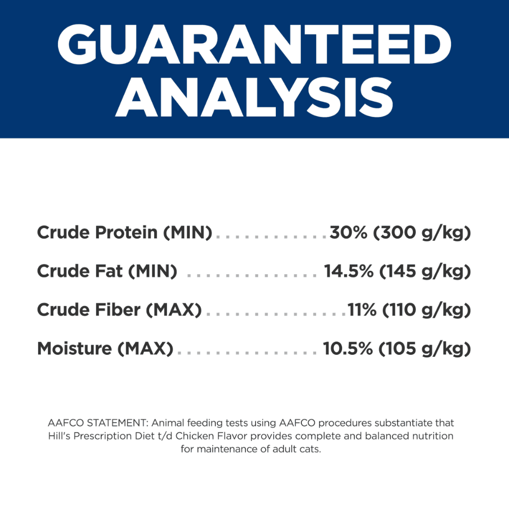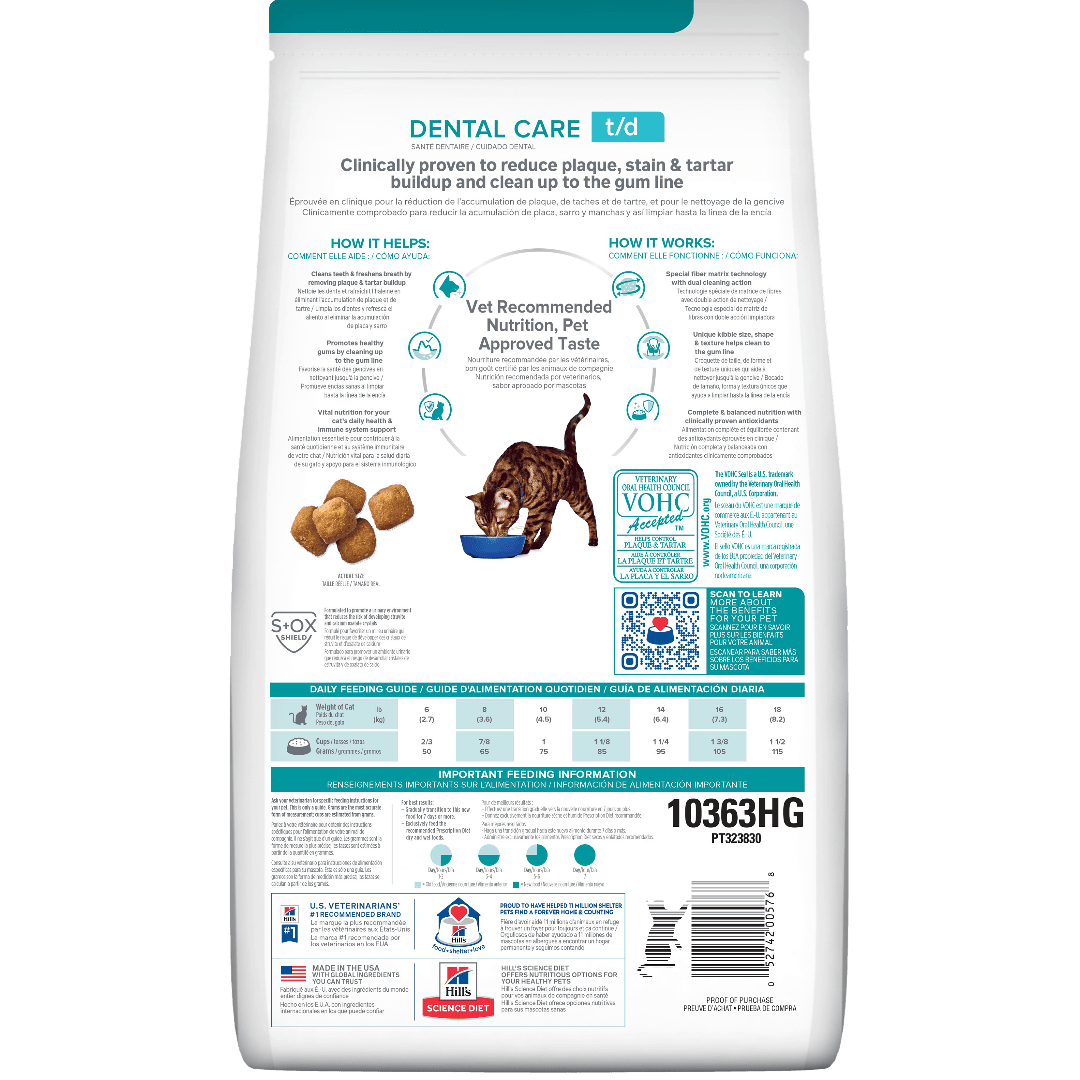Hill's Prescription Diet Td Dental Care Dry Cat Food offers vet-developed, clinically proven nutrition to reduce plaque & tartar. Backed by scientific research, its unique kibble technology scrubs teeth clean, supporting your cat's dental health as part of a therapeutic diet.