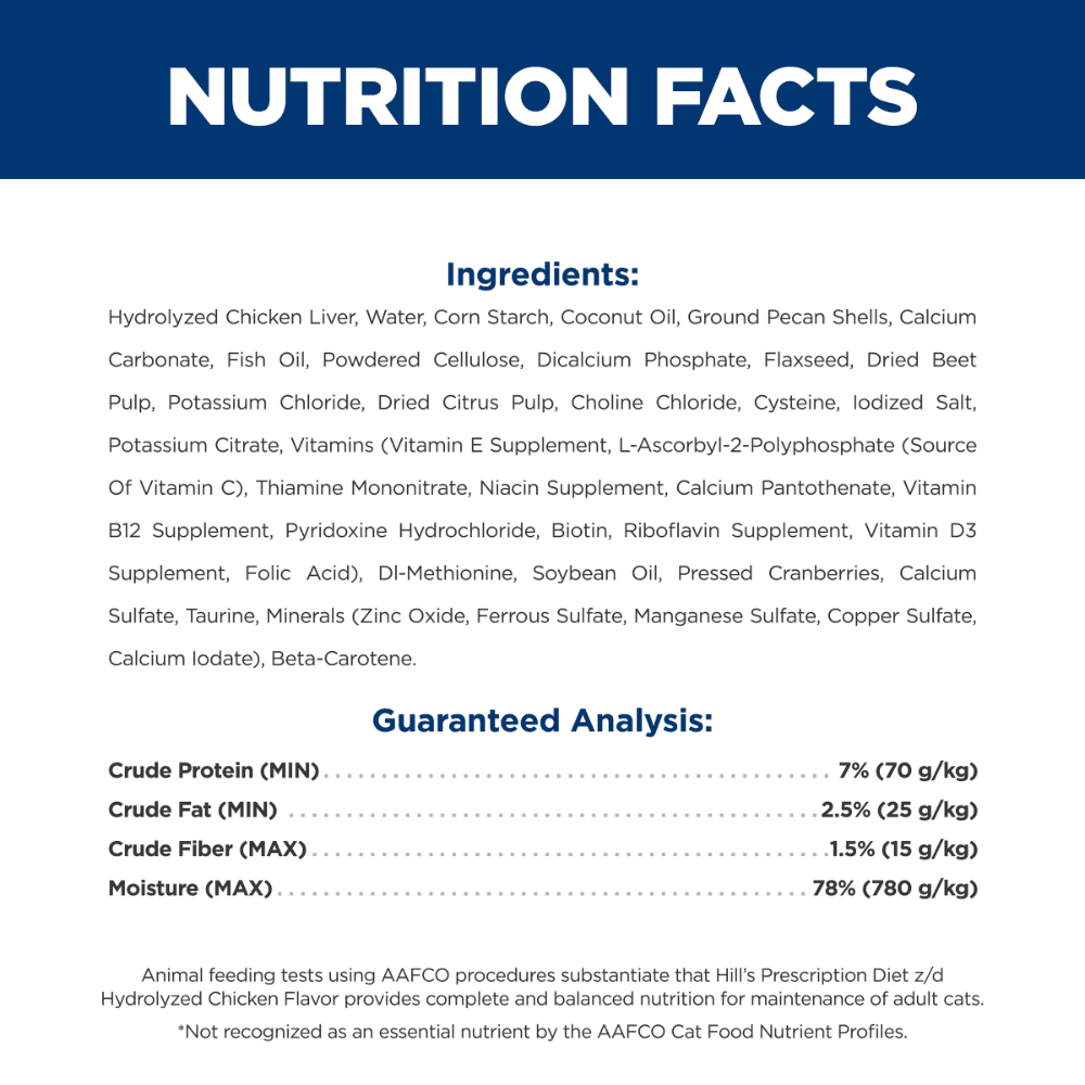 Hydrolyzed Chicken Liver, Water, Corn Starch, Coconut Oil, Ground Pecan Shells, Calcium Carbonate, Fish Oil, Powdered Cellulose, Dicalcium Phosphate, Flaxseed, Dried Beet Pulp, Potassium Chloride, Dried Citrus Pulp, Choline Chloride, Cysteine, Iodized Salt, Potassium Citrate, vitamins (Vitamin E Supplement, L-Ascorbyl-2-Polyphosphate (source of Vitamin C), Thiamine Mononitrate, Niacin Supplement, Calcium Pantothenate, Vitamin B12 Supplement, Pyridoxine Hydrochloride, Biotin, Riboflavin Supplement, Vitamin D3 Supplement, Folic Acid), DL-Methionine, Soybean Oil, Pressed Cranberries, Calcium Sulfate, Taurine, minerals (Zinc Oxide, Ferrous Sulfate, Manganese Sulfate, Copper Sulfate, Calcium Iodate), Beta-Carotene