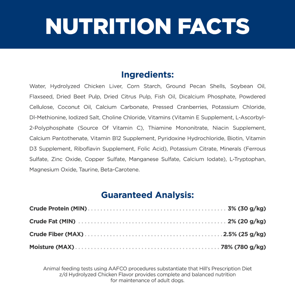 Water, Hydrolysed Chicken Liver, Corn Starch, Ground Pecan Shells, Soybean Oil, Flaxseed, Dried Beet Pulp, Dried Citrus Pulp, Fish Oil, Dicalcium Phosphate, Powdered Cellulose, Coconut Oil, Calcium Carbonate, Pressed Cranberries, Potassium Chloride, Dl-Methionine, Iodized Salt, Choline Chloride, Vitamins (Vitamin E Supplement, L-Ascorbyl-2-Polyphosphate (Source Of Vitamin C), Thiamine Mononitrate, Niacin Supplement, Calcium Pantothenate, Vitamin B12 Supplement, Pyridoxine Hydrochloride, Biotin, Vitamin D3 Supplement, Riboflavin Supplement, Folic Acid), Potassium Citrate, Minerals (Ferrous Sulfate, Zinc Oxide, Copper Sulfate, Manganese Sulfate, Calcium Iodate), L-Tryptophan, Magnesium Oxide, Taurine, Beta-Carotene