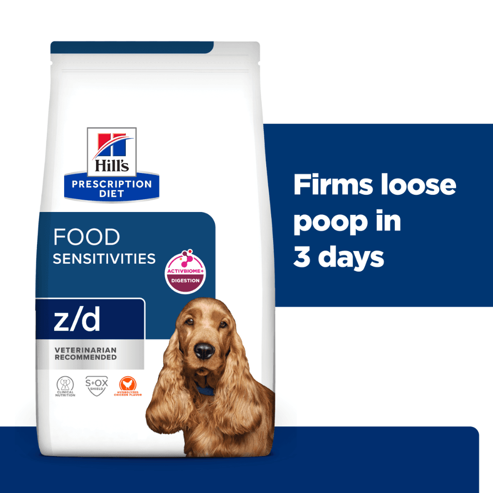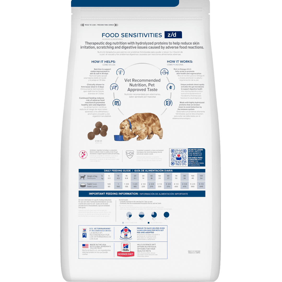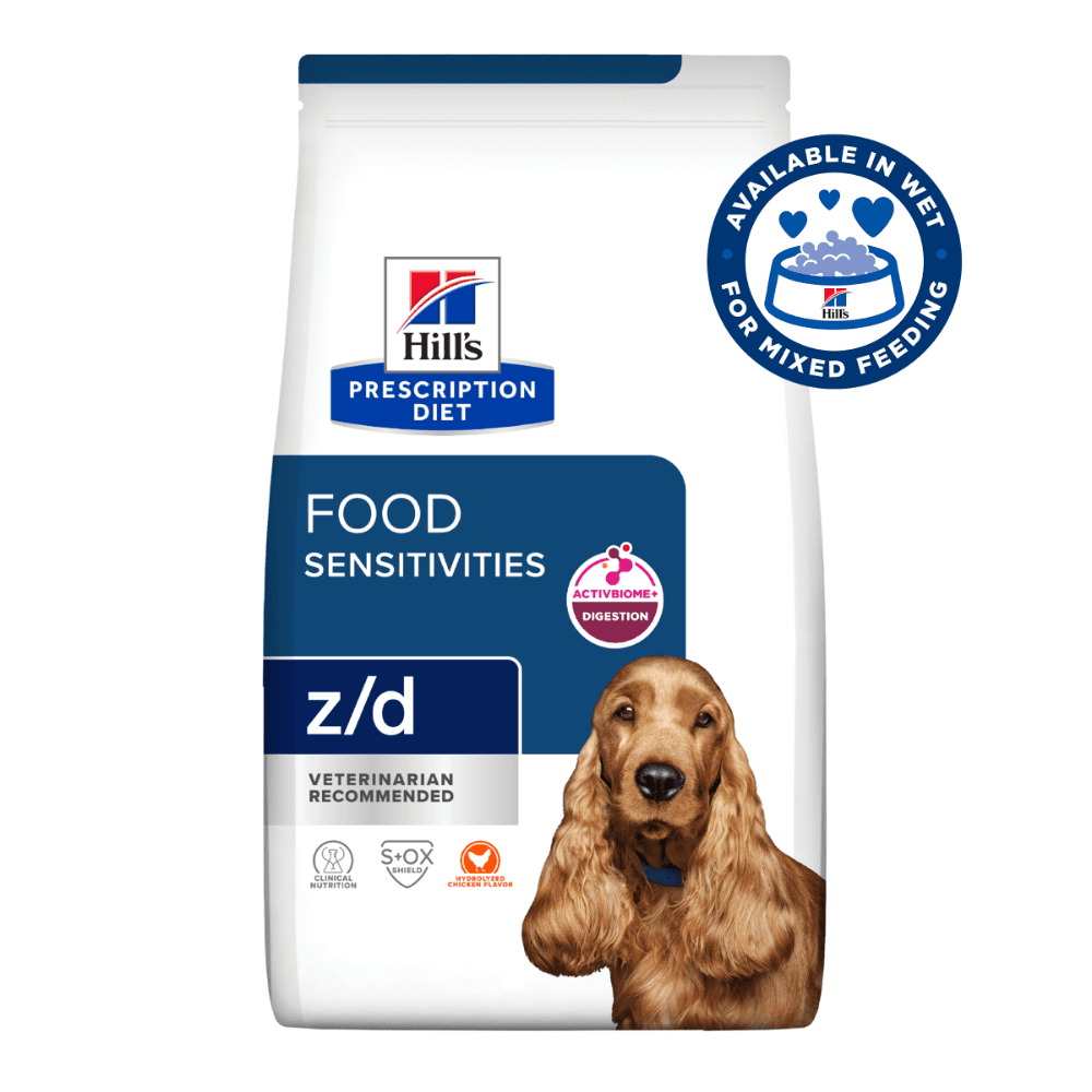 Hill's Prescription Diet Z/D Skin & Food Sensitivities Adult Dry Dog Food is a specialised, vet-developed formula made to help adult dogs dealing with itchy skin or tummy troubles caused by food reactions. This gentle, highly digestible recipe avoids common allergens and supports better nutrient absorption so your dog can feel more comfortable from the inside out.