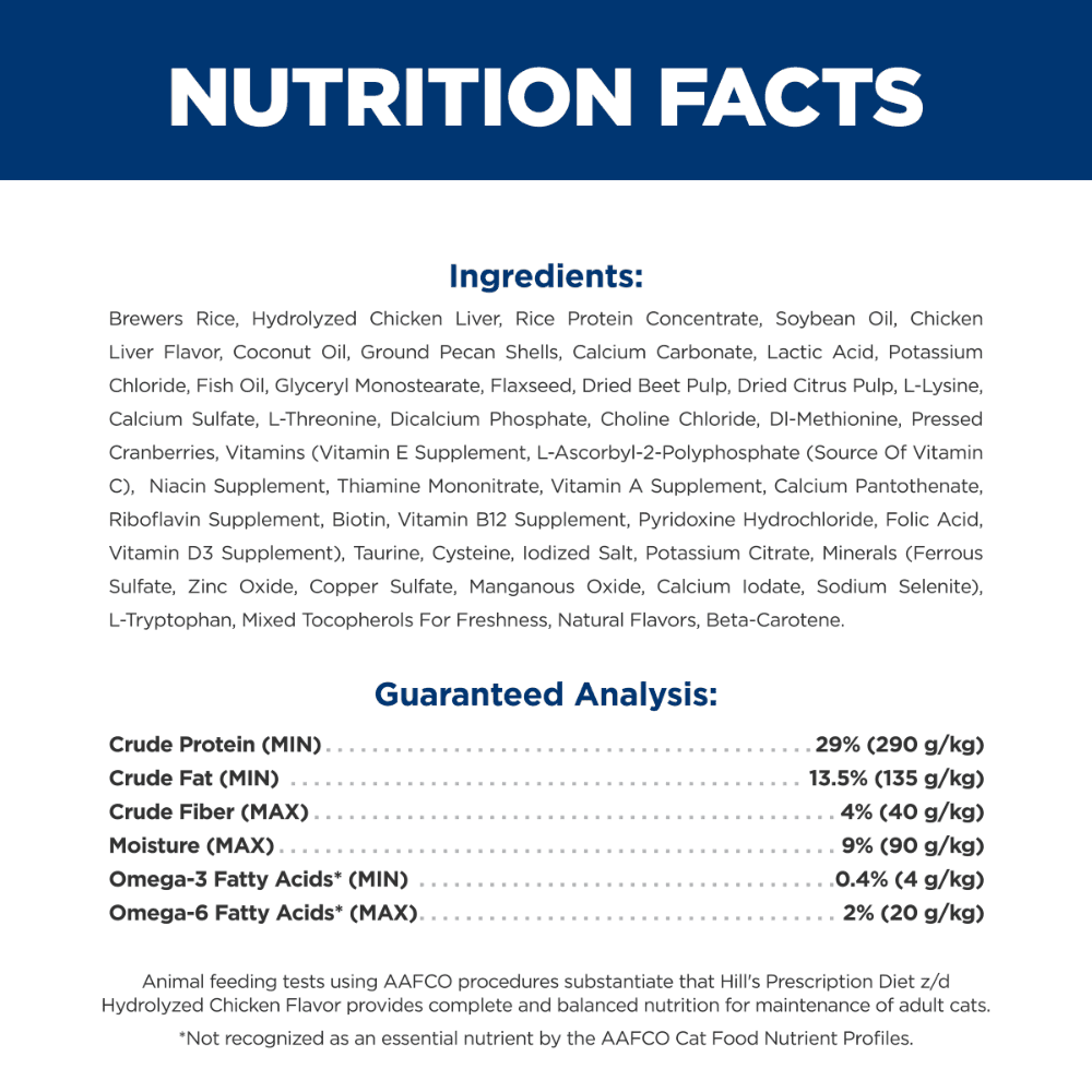 Brewers Rice, Hydrolyzed Chicken Liver, Soybean Oil, Powdered Cellulose, Chicken Liver Flavor, Lactic Acid, Calcium Carbonate, Calcium Sulfate, Glyceryl Monostearate, Potassium Chloride, DL-Methionine, Choline Chloride, vitamins (Vitamin E Supplement, L-Ascorbyl-2-Polyphosphate (source of Vitamin C), Niacin Supplement, Thiamine Mononitrate, Vitamin A Supplement, Calcium Pantothenate, Riboflavin Supplement, Biotin, Vitamin B12 Supplement, Pyridoxine Hydrochloride, Folic Acid, Vitamin D3 Supplement), Taurine, Iodized Salt, Dicalcium Phosphate, minerals (Ferrous Sulfate, Zinc Oxide, Copper Sulfate, Manganous Oxide, Calcium Iodate, Sodium Selenite), Mixed Tocopherols for freshness, Natural Flavors, Beta-Carotene