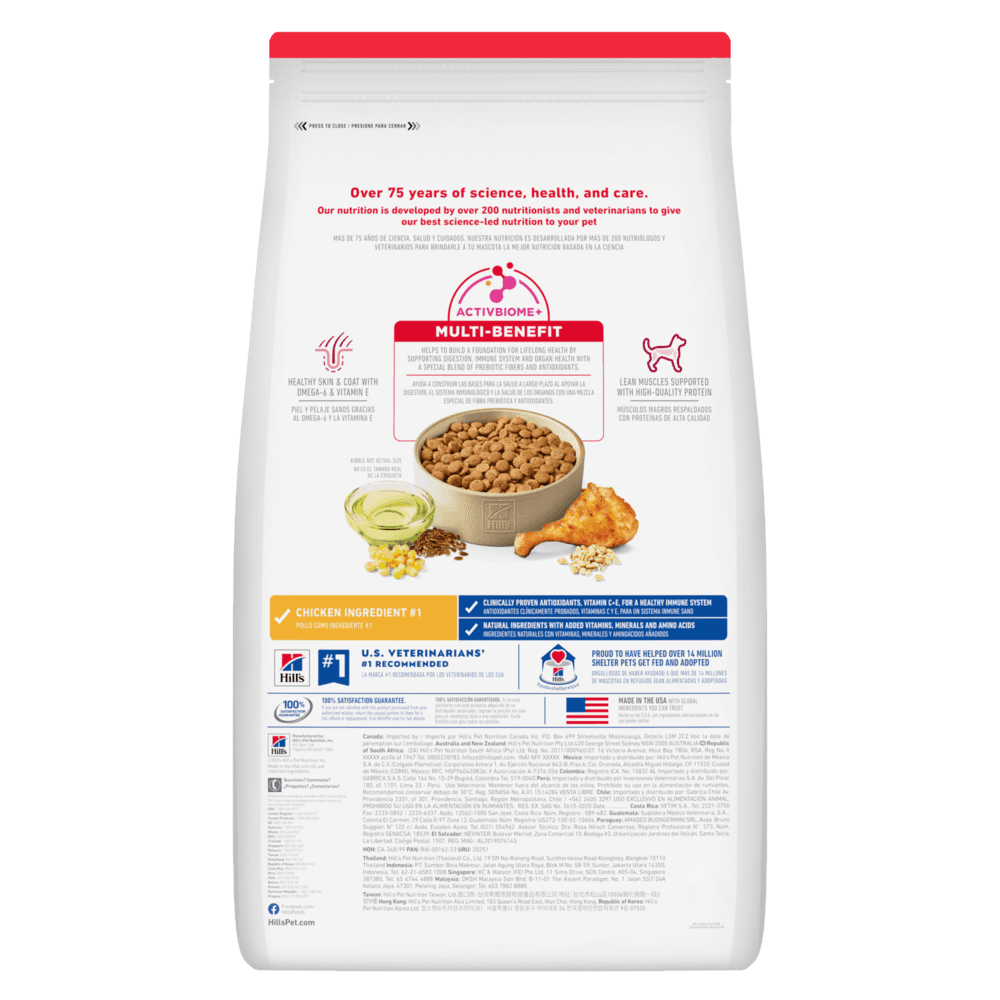 Chicken, Whole Grain Wheat, Cracked Pearled Barley, Whole Grain Sorghum, Whole Grain Corn, Corn Gluten Meal, Chicken Meal, Chicken Fat, Chicken Liver Flavor, Dried Beet Pulp, Soybean Oil, Pork Flavor, Lactic Acid, Flaxseed, Potassium Chloride, Choline Chloride, Iodized Salt, Calcium Carbonate, vitamins (Vitamin E Supplement, LAscorbyl 2 Polyphosphate (source of Vitamin C), Niacin Supplement, Thiamine Mononitrate, Vitamin A Supplement, Calcium Pantothenate, Riboflavin Supplement, Biotin, Vitamin B12 Supplement, Pyridoxine Hydrochloride, Folic Acid, Vitamin D3 Supplement), minerals (Ferrous Sulfate, Zinc Oxide, Copper Sulfate, Manganous Oxide, Calcium Iodate, Sodium Selenite), Taurine, Oat Fiber, Mixed Tocopherols for freshness, Natural Flavors, Beta Carotene, Apples, Broccoli, Carrots, Cranberries, Green Peas.