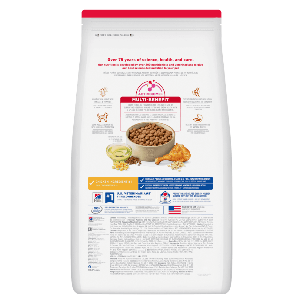 Chicken, Cracked Pearled Barley, Brown Rice, Brewers Rice, Whole Grain Wheat, Whole Grain Corn, Corn Protein Meal, Chicken Meal, Chicken Fat, Chicken Liver Flavor, Soybean Meal, Dried Beet Pulp, Soybean Oil, Lactic Acid, Flaxseed, Pork Liver Flavor, Potassium Chloride, Iodized Salt, Whole Grain Oats, Fructooligosaccharides (FOS), Choline Chloride, Calcium Carbonate, vitamins (Vitamin E Supplement, LAscorbyl-2-Polyphosphate (source of Vitamin C), Niacin Supplement, Thiamine Mononitrate, Vitamin A Supplement, Calcium Pantothenate, Biotin, Vitamin B12 Supplement, Riboflavin Supplement, Pyridoxine Hydrochloride, Folic Acid, Vitamin D3 Supplement), Taurine, minerals (Ferrous Sulfate, Zinc Oxide, Copper Sulfate, Manganous Oxide, Calcium Iodate, Sodium Selenite), Mixed Tocopherols for freshness, Natural Flavors, Beta-Carotene